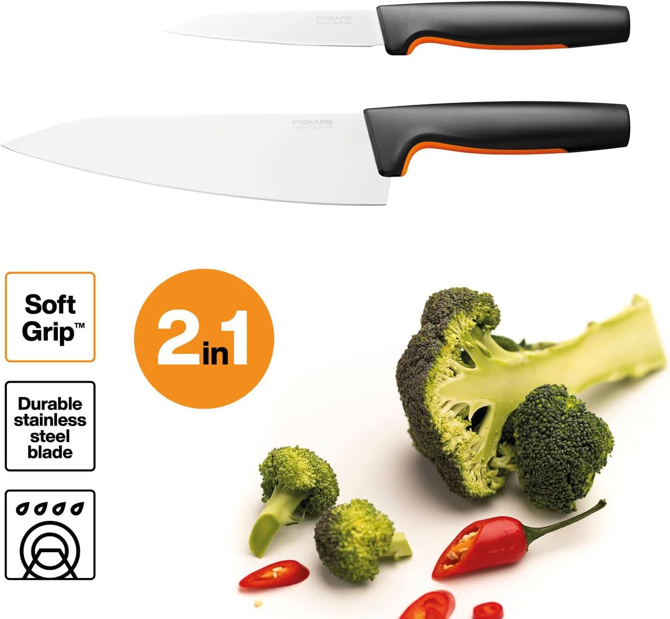 - Lieferumfang: 1x Fiskars Functional Form Küchenmesser-Set, 2-tlg., 1 grosses Kochmesser (32 cm), 1 Gemüsemesser (23 cm), Material: Japanischer Edelstahl/Kunststoff, Farbe: Silber/Schwarz/Orange, 1057557