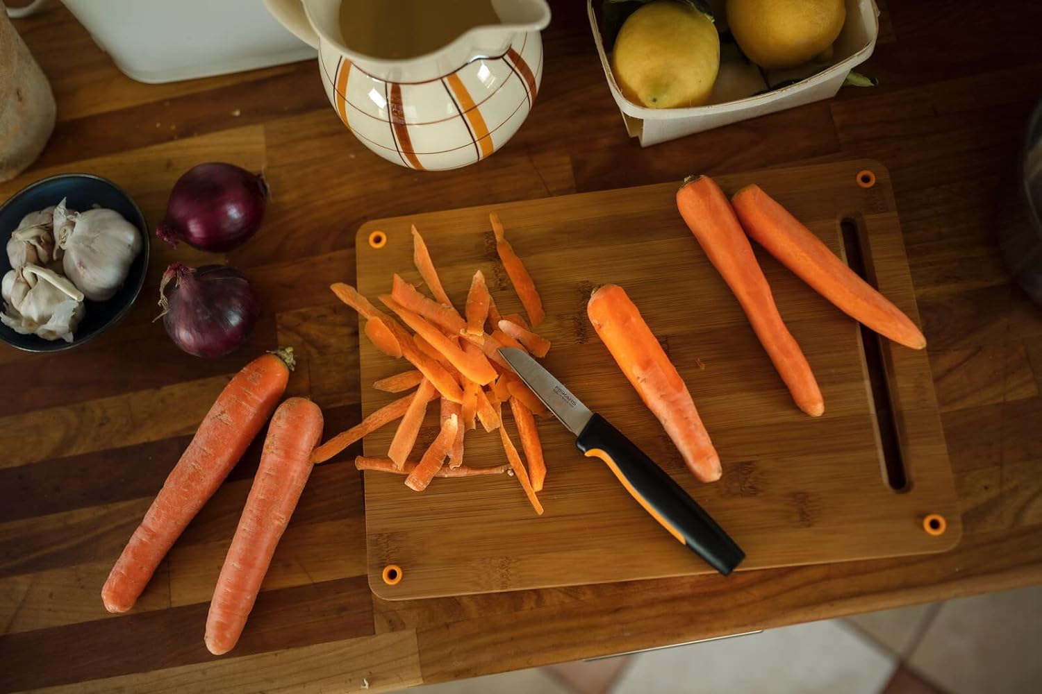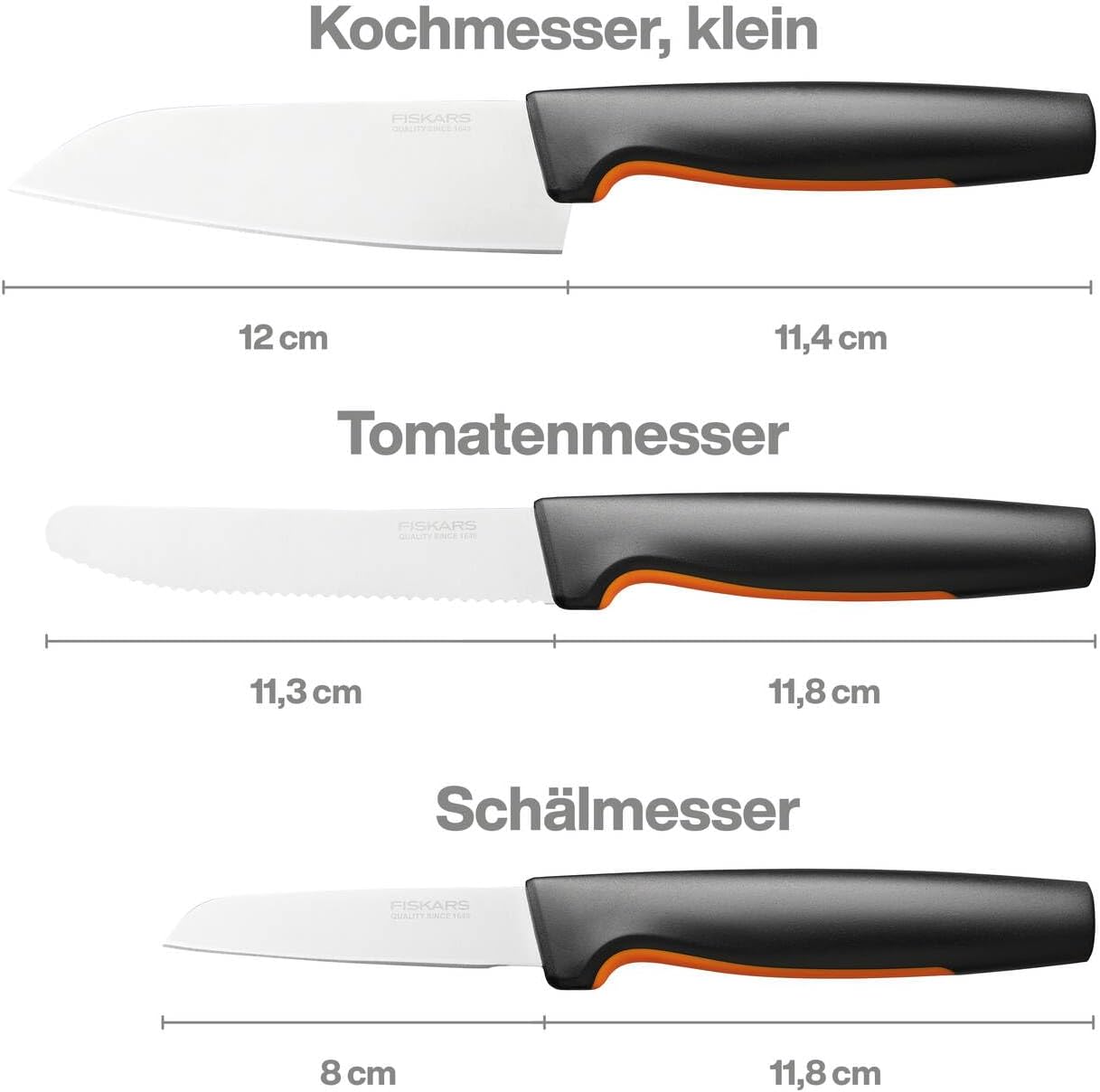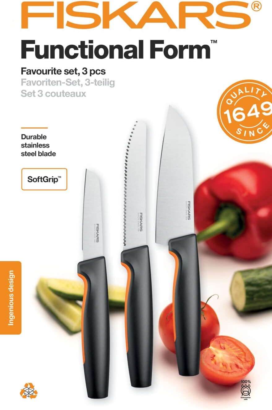 - Lieferumfang: 1x Fiskars Functional Form Küchenmesser-Set, 3-tlg., 1 kleines Kochmesser (23 cm), 1 Tomatenmesser (23 cm), 1 Schälmesser (20 cm), Material: Japanischer Edelstahl/Kunststoff, Farbe: Silber/Schwarz/Orange, 1057556