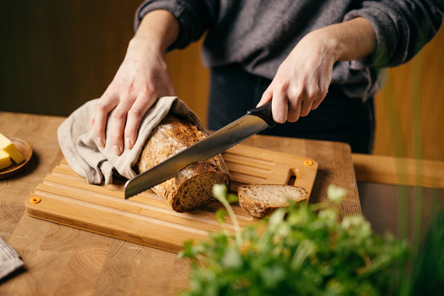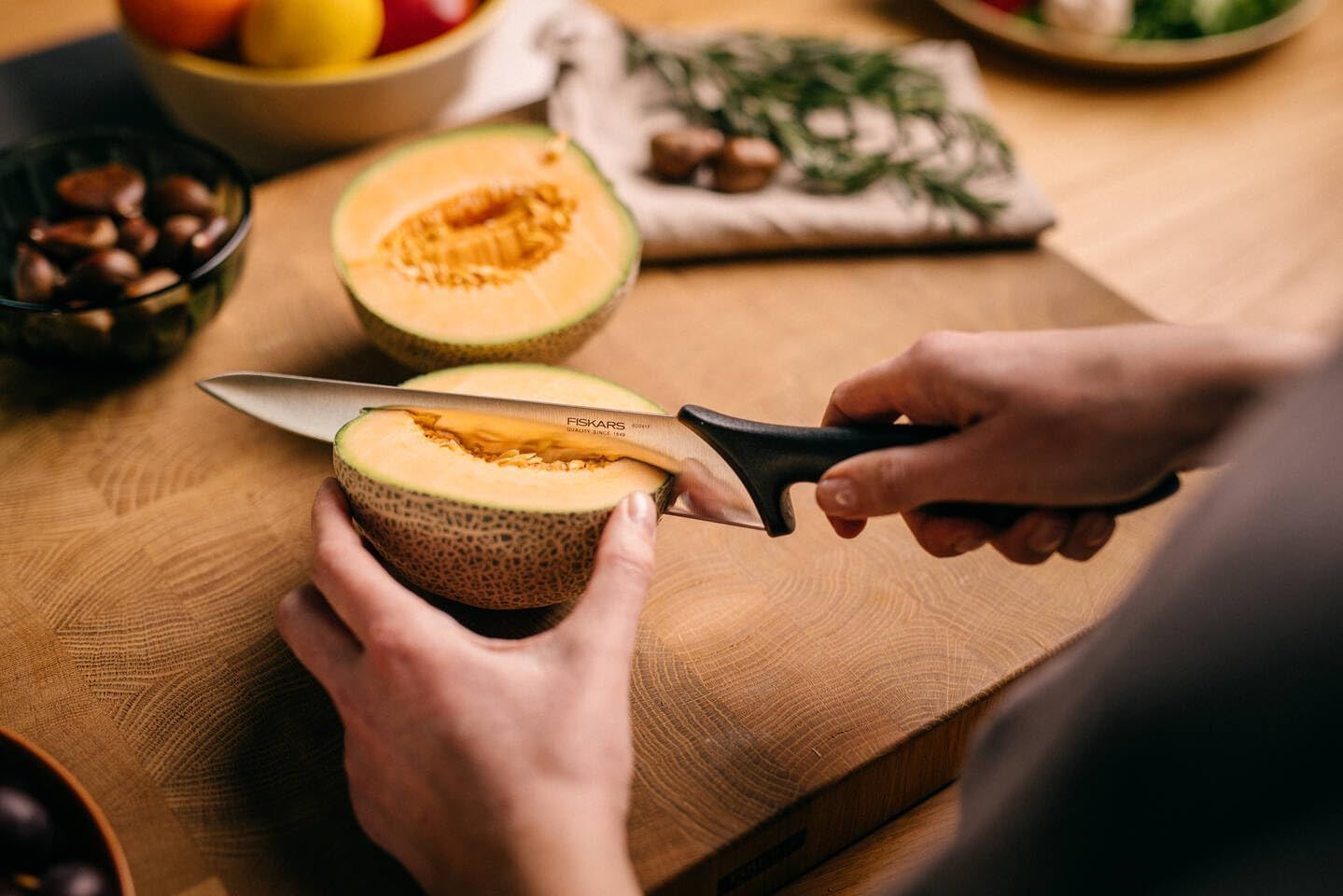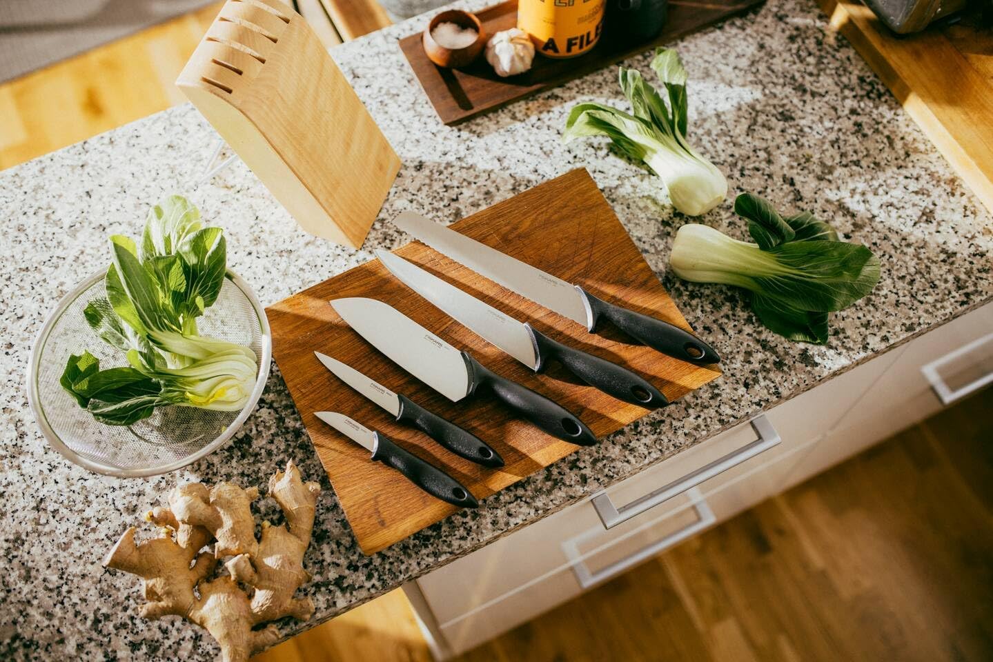 - Lieferumfang: 1x Fiskars Messerblock, Essential, Inkl. 1x Gemüsemesser, 1x Schälmesser, 1x Santoku-Messer, 1x Küchenmesser, 1x Brotmesser, Masse: 38 x 16 x 8 cm, Gewicht: 1385 g, Material: Birkenholz, 1023782