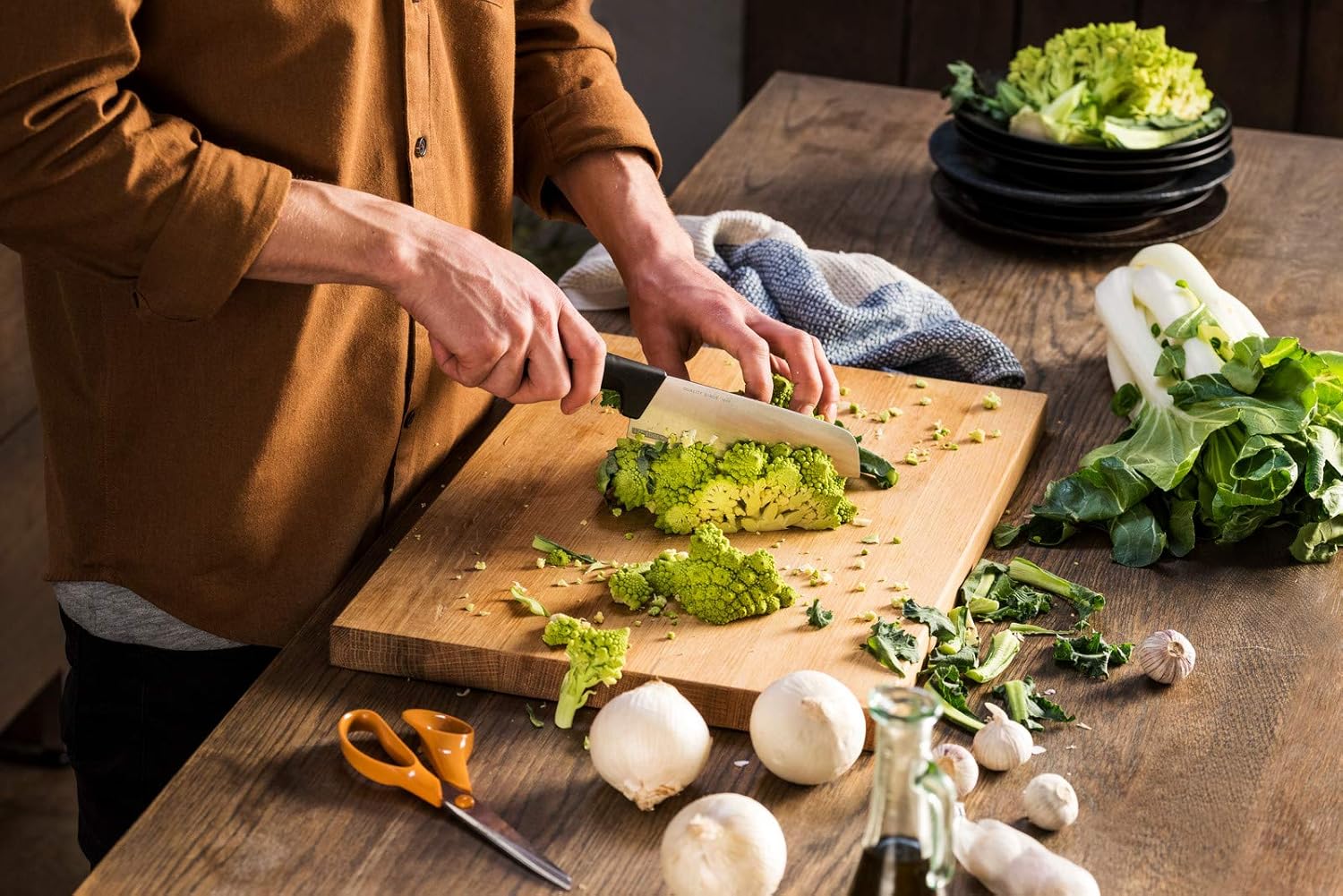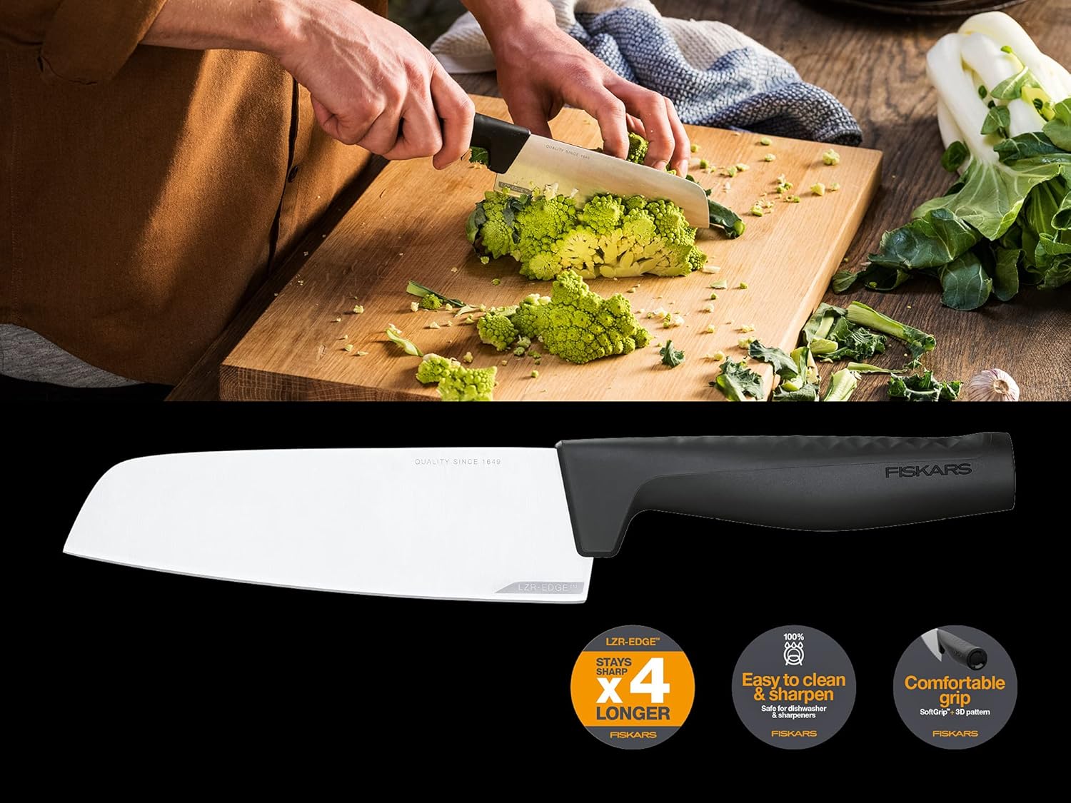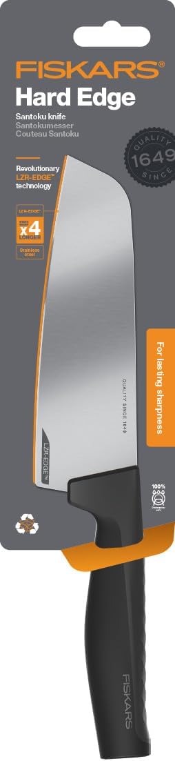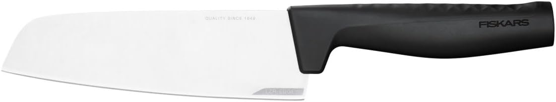 - Lieferumfang: 1x Fiskars Santoku-Messer, Hard Edge, Masse: Schneidklingenlänge: 16,1 cm, Masse: Gesamtlänge: 29,1 cm, Gewicht: 147 g, Material: Qualitätsstahl/Kunststoff, Farbe: Silber/Schwarz, 1051761