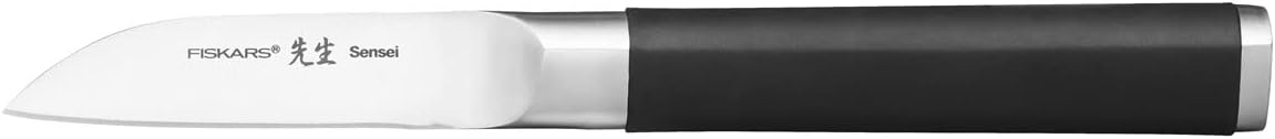 - Lieferumfang: 1x Fiskars Sensei Schälmesser, Klingenlänge: 7 cm, Gesamtlänge: 18,2 cm, Gewicht: 71 Gramm, Material: Rostfreier Stahl mit hohem Kohlenstoffgehalt/Kunststoff, Farbe: Silber/Schwarz, 1024273