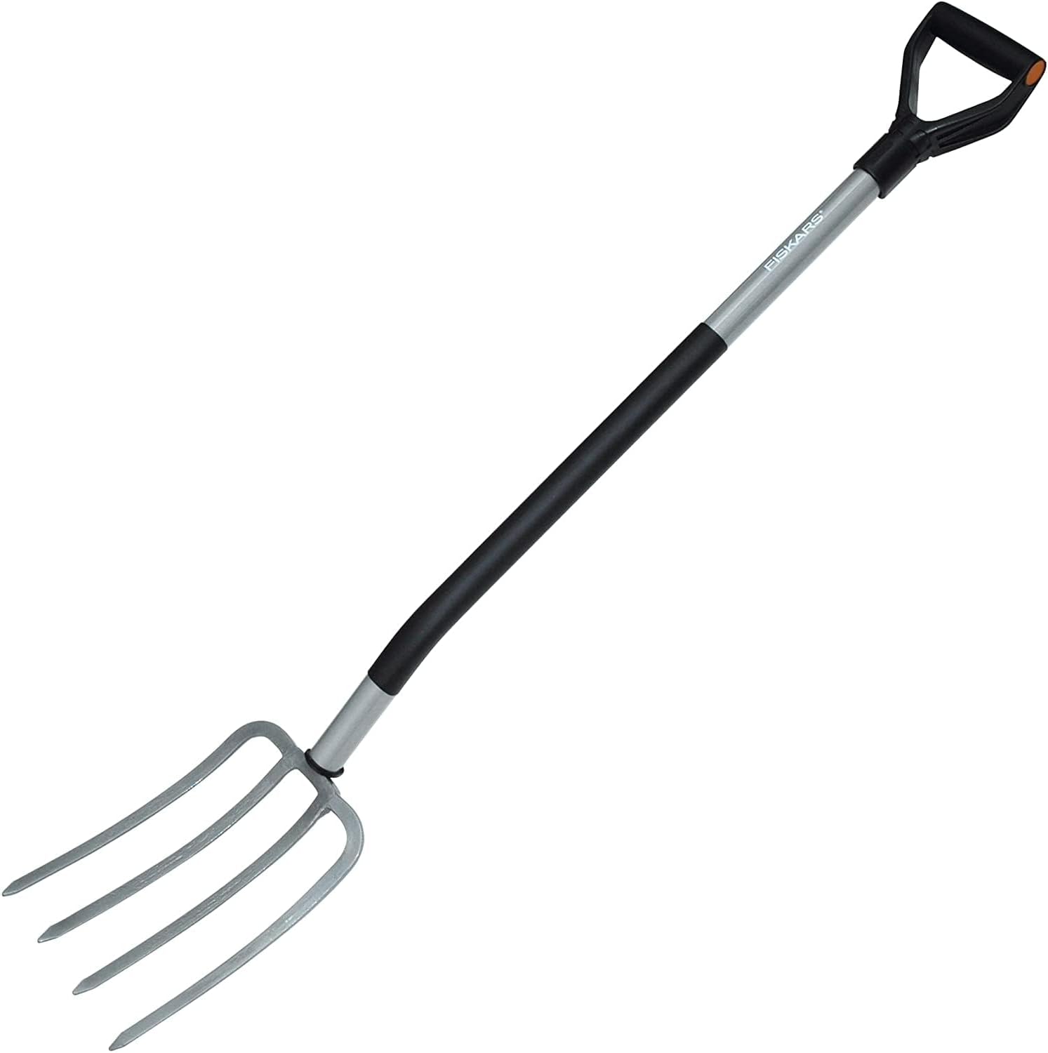 - Lieferumfang: 1x Fiskars Ergonomic Spatengabel, Länge: 122 cm, Gewicht: 2,08 kg, Material: Borstahl, Farbe: Grau/Schwarz, 1001413