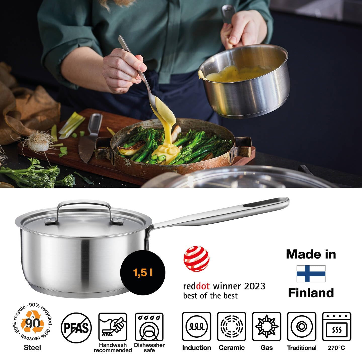 - Lieferumfang: 1x Fiskars Stieltopf, 1,5 l, All Steel, Masse: 38 x 16 x 12 cm, Gewicht: 1 kg, Material: Edelstahl, Farbe: Silber, 1064750