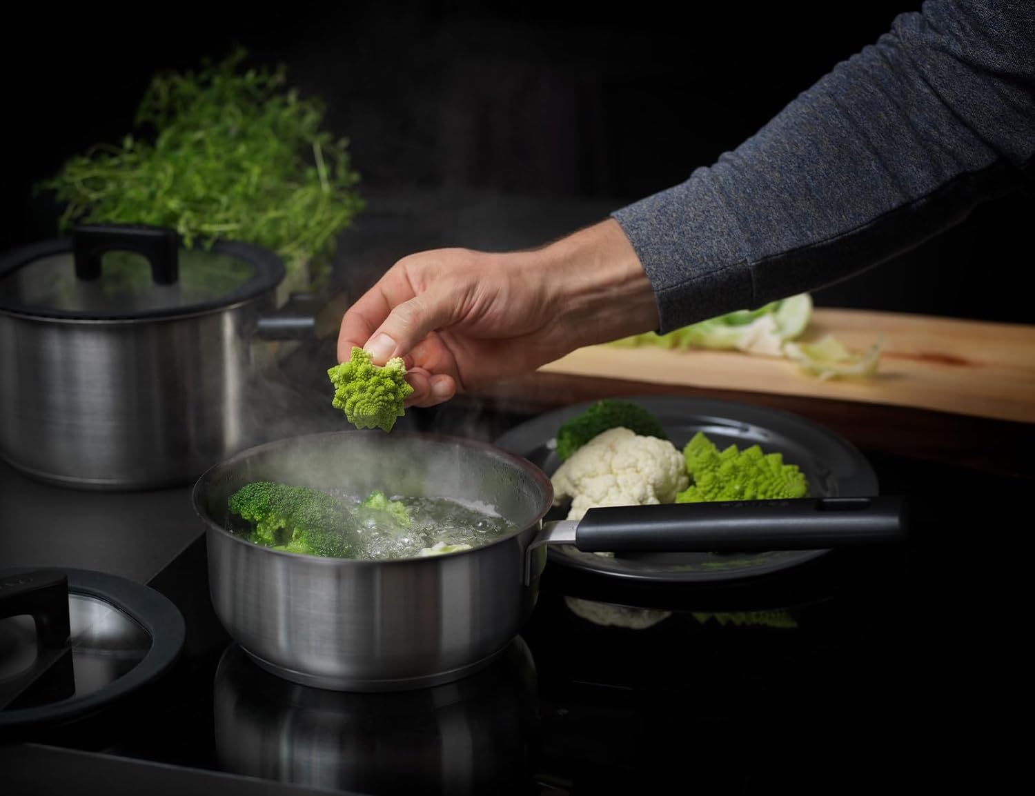 - Sieb-Löcher am Deckelrand für einfaches Abgiessen von Wasser, Keine Verbrennungsgefahr dank kühlbleibender Bakelit-Griffe an Topf und Deckel