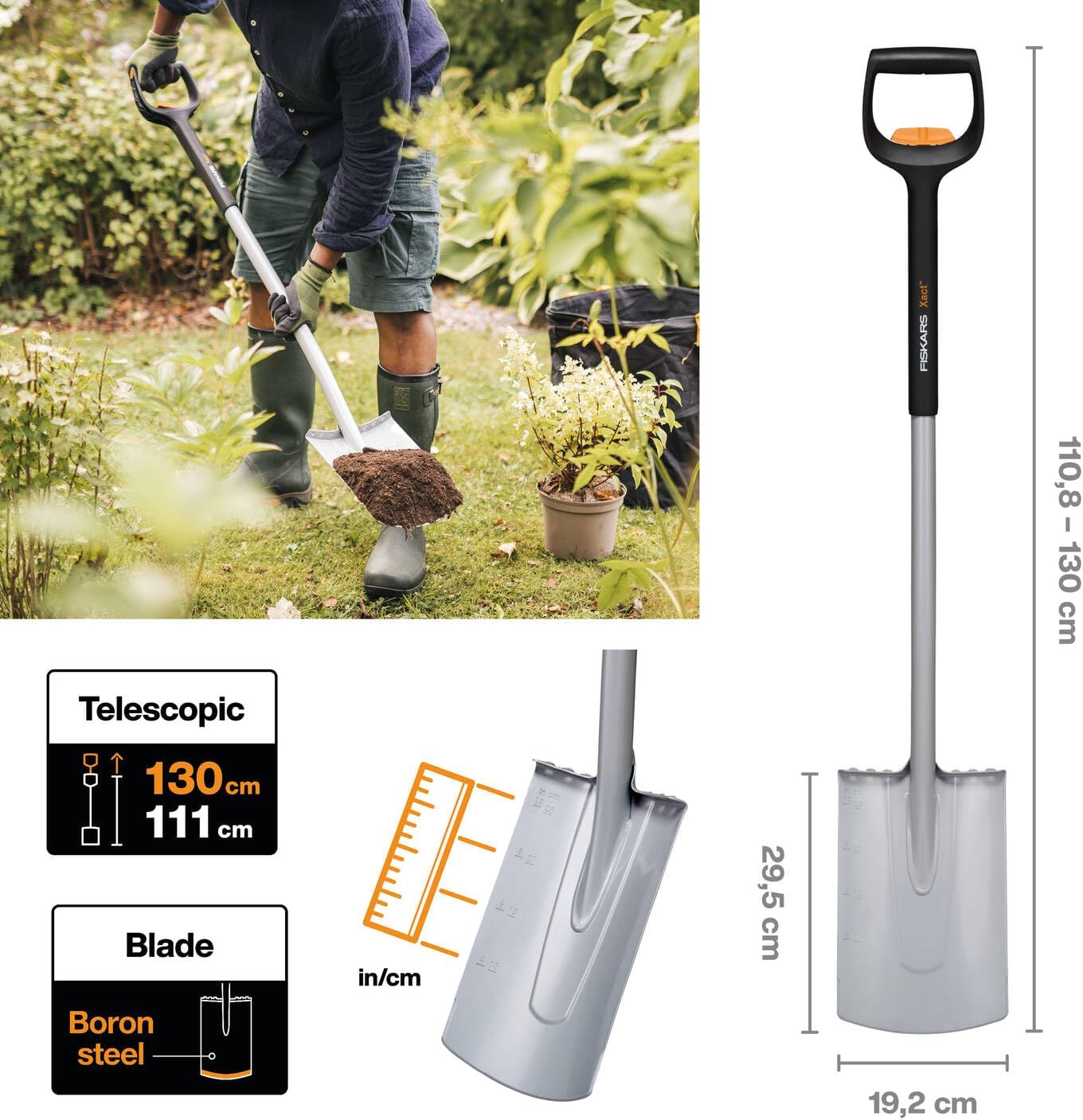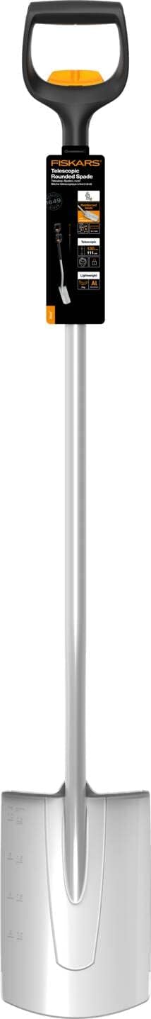 - Lieferumfang: 1x Fiskars Teleskop-Spaten für weiche, steinarme Böden, Rund, 111-130 cm, 1,73 kg, Borstahl-Blatt, Schwarz/Orange, Xact, 1066733