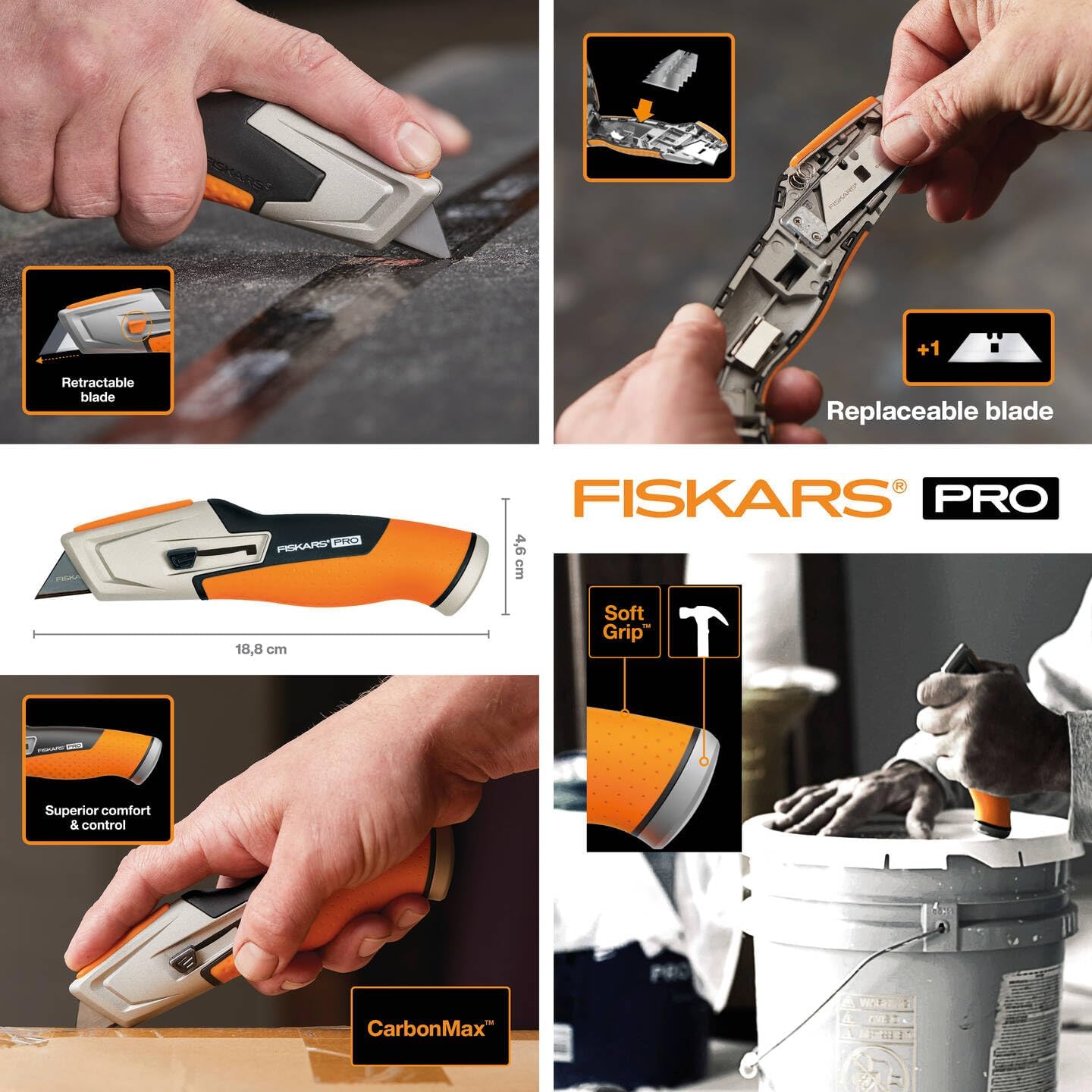- Lieferumfang: 1x Fiskars CarbonMax Universalmesser mit einziehbarer Klinge, Inklusive Ersatzklinge, Länge: 17,7 cm, Gewicht: 171 g, Material: Rostfreier Stahl/Kunststoff, Farbe: Schwarz/Orange, 1027223
