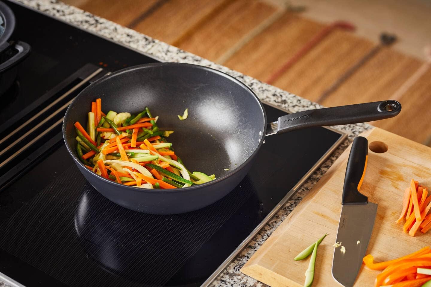 - Lieferumfang: 1x Fiskars Wok Ø 28 cm, Functional Form, Masse: 30,5 x 48,4 x 14,5 cm, Gewicht: 1,55 kg, Material: Aluminium, Farbe: Schwarz, 1027705