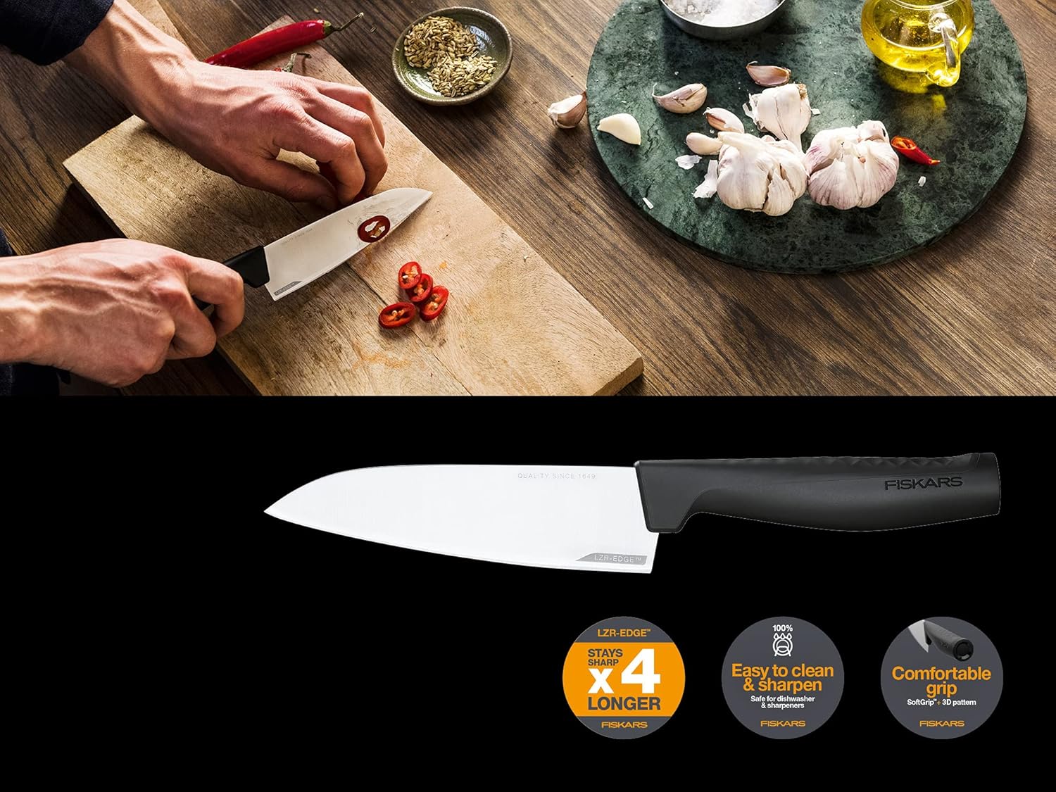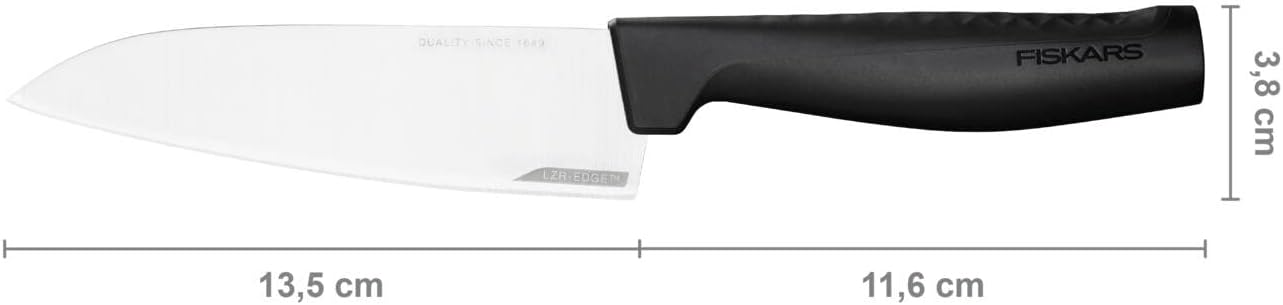 - Lieferumfang: 1x Fiskars Kochmesser, Hard Edge, Masse: Schneideklingenlänge 13,5 cm, Gesamtlänge: 25,1 cm, Gewicht: 93 g, Material: Qualitätsstahl/Kunststoff, Farbe: Silber/Schwarz, 1051749