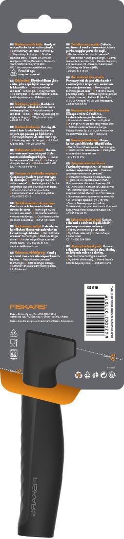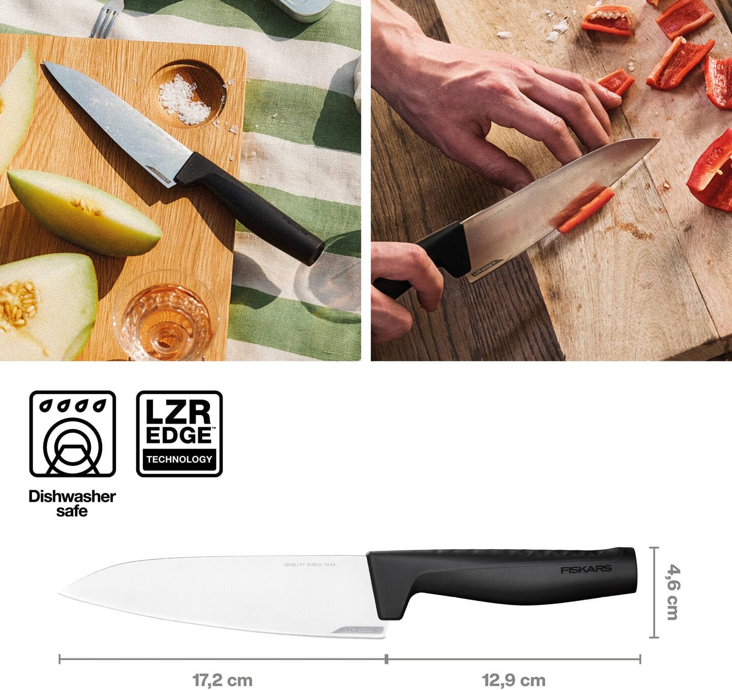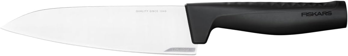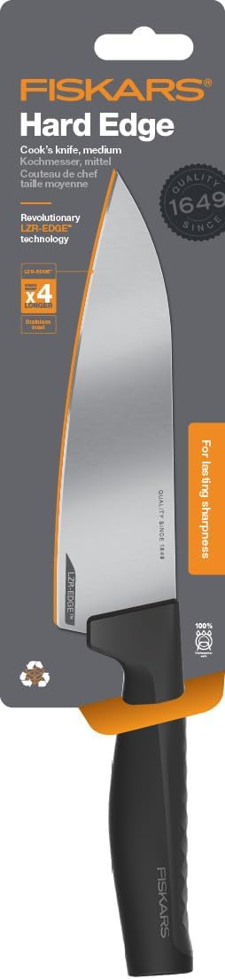 - Lieferumfang: 1x Fiskars Kochmesser, Hard Edge, Masse: Schneidklingenlänge: 17,2 cm, Gesamtlänge: 30,1 cm, Gewicht: 138 g, Material: Qualitätsstahl/Kunststoff, Farbe: Silber/Schwarz, 1051748