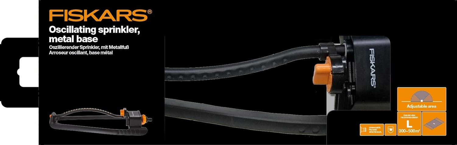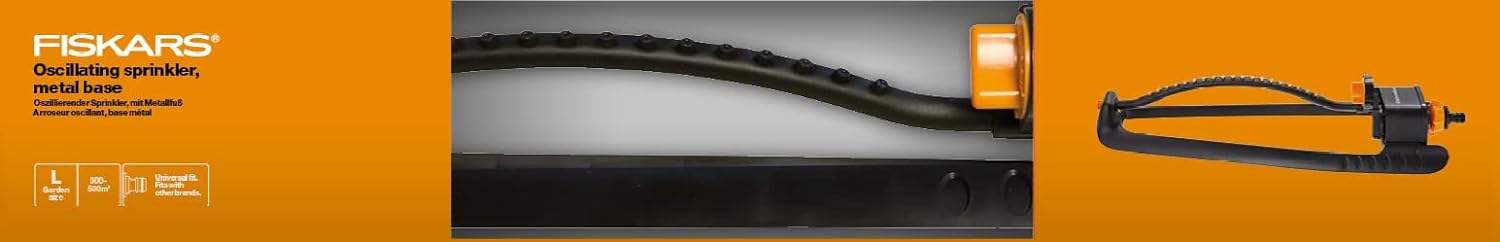 - Lieferumfang: 1x Fiskars Sprinkler L, Masse (LxBxH): 17,9x8,5x51,2 cm, Gewicht: 654 g, Schwarz/Orange, 1023660