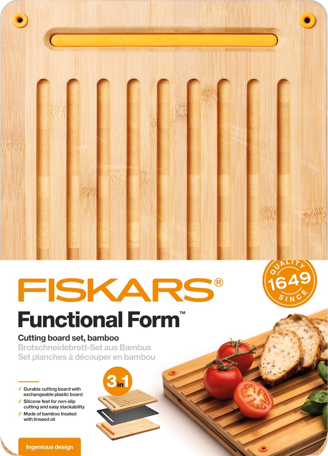 - Lieferumfang: 1x Fiskars Functional Form Schneidstation, 3-tlg., Masse: 35 x 25 x 3,8 cm, Gewicht: 1982 g, Material: Bambus/Kunststoff, Farbe: Holz/Schwarz/Orange, 1057550