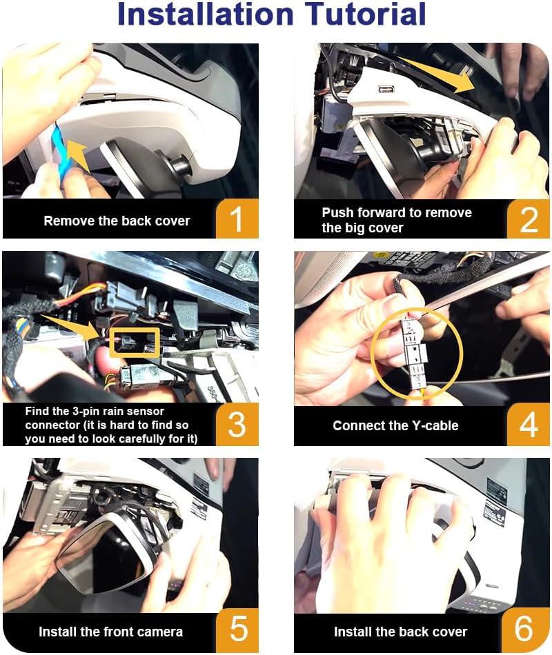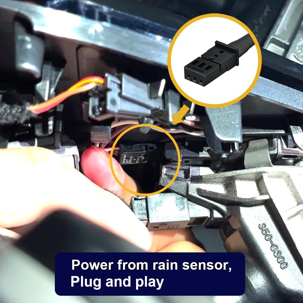 - 【Einfach zu installieren, keine Verkabelung erforderlich】 Keine Notwendigkeit, die A-Säule zu demontieren, kein Zigarettenanzünder zu belegen. Geteilte Stromversorgung von Regensensor über Y-Stecker. Nach der Installation der Autokamera wird die