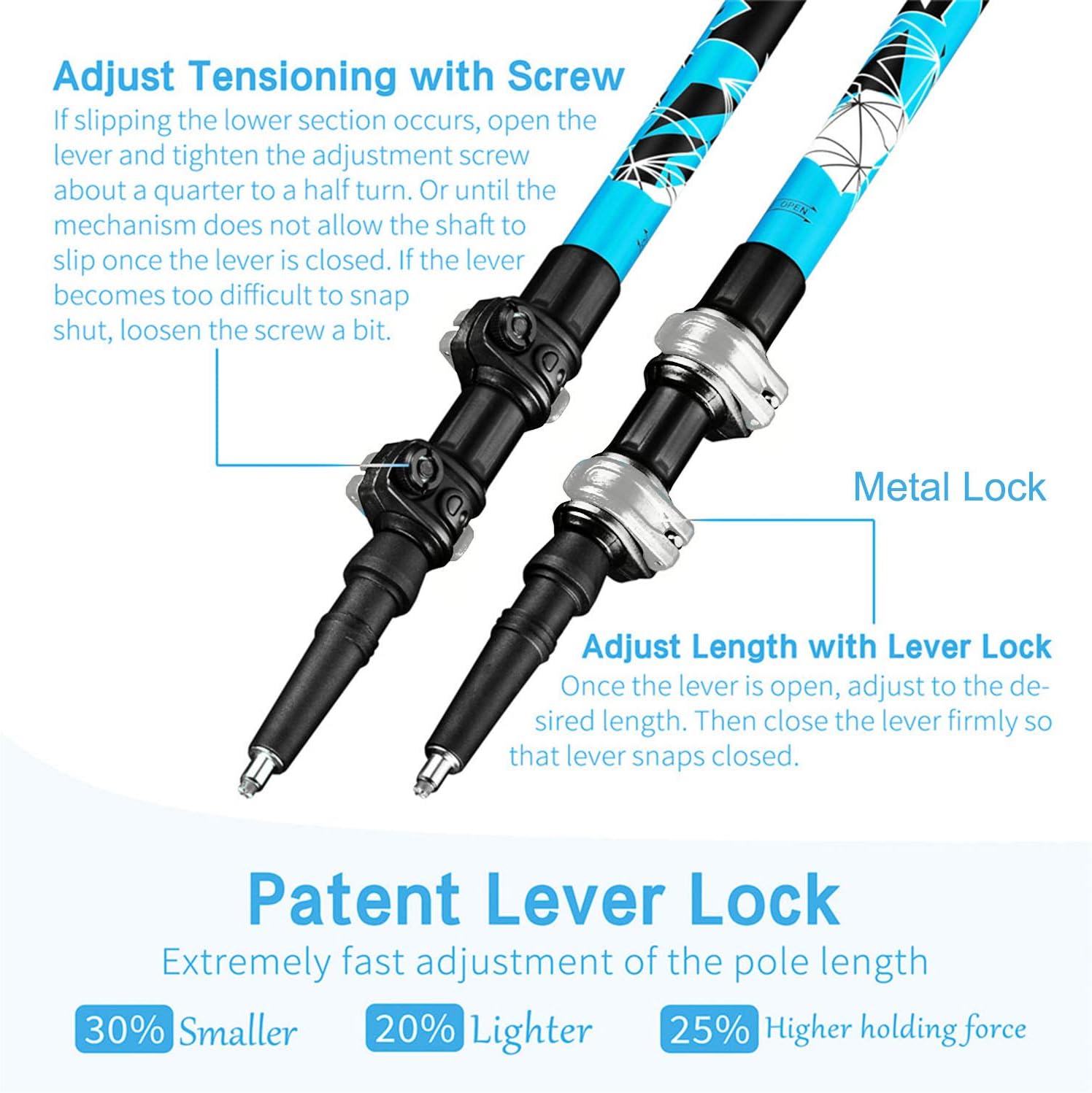 • ✅Neuestes Patent-Hebelschloss - 30% kleiner, 20% leichter und 25% höhere Haltekraft, schnell und einfach einzustellen, auch mit Handschuhen. Extrem schnelle Einstellung der Stocklänge von 67 cm bis 135 cm, ausziehbare Kinderstöcke von 58 cm bis 94