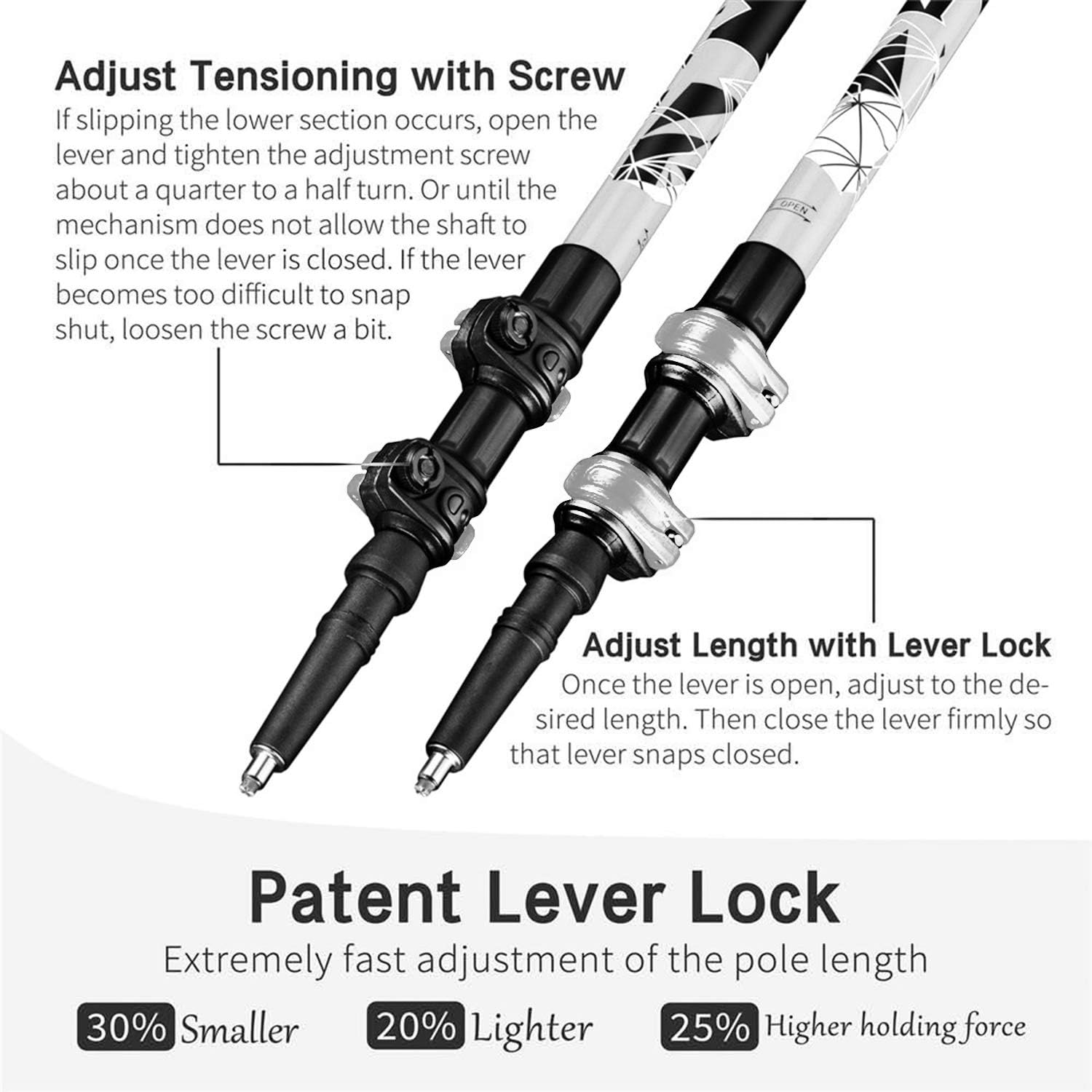 - ?Neuester patentierter Hebelverschluss, 30 % kleiner, 20 % leichter und 25 % höhere Haltekraft, schnell und einfach einzustellen, sogar mit Handschuhen. Extrem schnelle Einstellung der Stocklänge von 26 Zoll bis 53 Zoll, passend für jeden von 2'7''