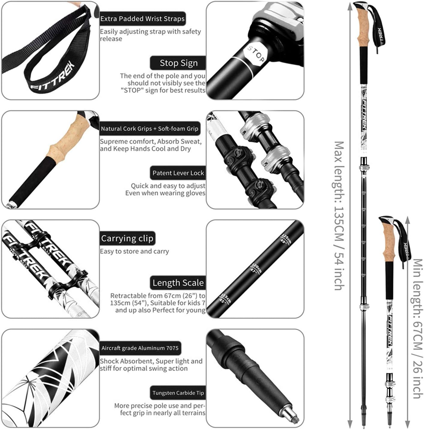 - ? IDEAL FÜR JEDEN Die FitTrek-Trekkingstöcke sind eine grossartige Wahl für alle, vom Anfänger bis zum Experten, für Kinder, Jugendliche, Erwachsene und Senioren. Die vielseitige Grösse unserer Trekkingstöcke bedeutet, dass jeder von 2'7'' bis