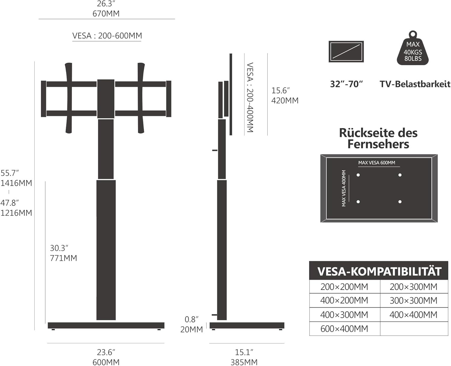 - 【UNIVERSELL UND KOMPATIBEL】Geeignet für TV-Geräte, PC-Monitore mit Bildschirmdiagonale 32-70 Zoll bis zu 40kg. VESA Modelle 200*200-400*600. Kompatibel mit die meisten TV-Marken. Bitte überprüfen Sie die Grösse, das Gewicht und den VESA ihres