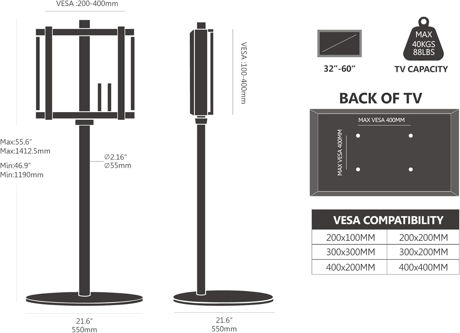 - 【TV-KOMPATIBILITÄT】Der TV Standfuss passt zu den meisten Fernsehern von 32 bis 60 Zoll mit einer maximalen Tragfähigkeit von 40 kg(88lbs).VESA-Kompatibilität von 200x100mm bis zu 400x400mm. Bitte überprüfen Sie die Grösse, das Gewicht und den VESA ihres Fernsehers vor dem Kauf sorgfältig.
