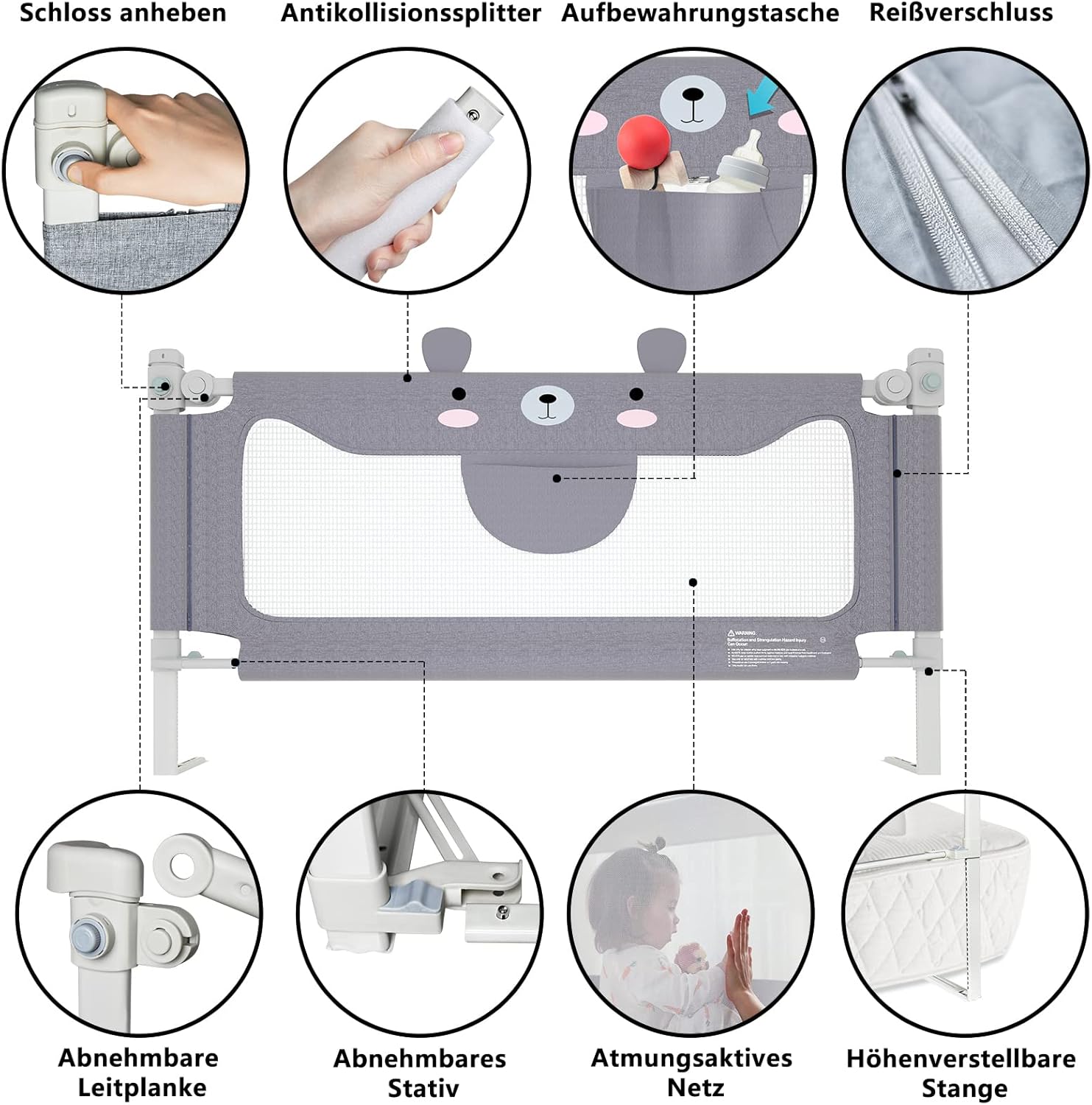 - Vielseitige Eigenschaften und Grau-Farbgebung - Mit einer Länge von 180 cm und einer grauen Farbgebung passt sich dieses Bettgitter nahtlos verschiedenen Betten an. Hergestellt aus einem Metallrahmen, Leinenstoff und Kunststoffelementen, ist es für