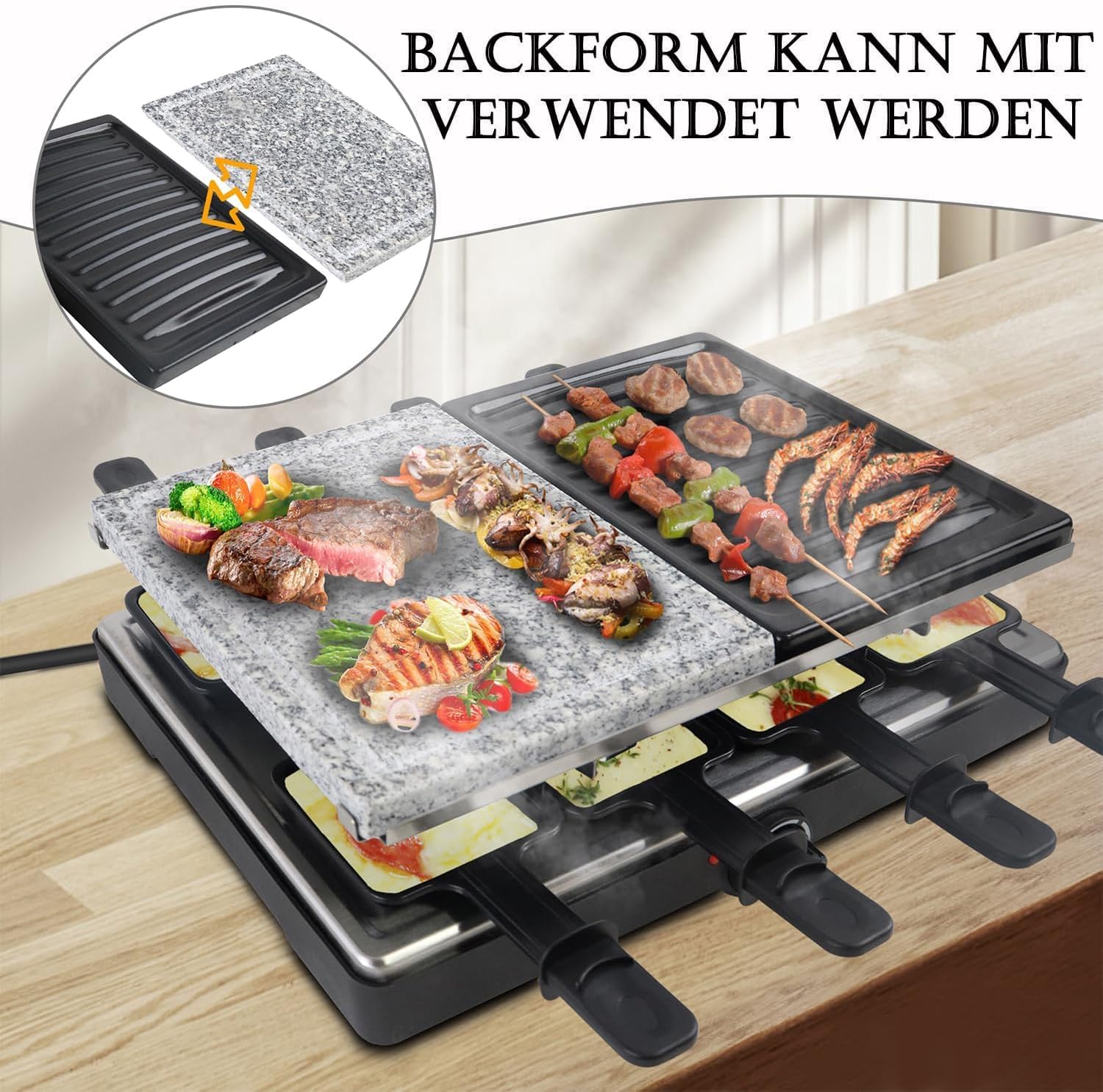 - 3 Möglichkeiten zum Grillen: Ausgestattet mit 2 Granitplatten, 2 Antihaftplatten, 8 Tabletts und Holzspateln können die Backbleche zusammen verwendet werden und bieten so vielfältige Kochmöglichkeiten für eine Vielzahl köstlicher Speisen