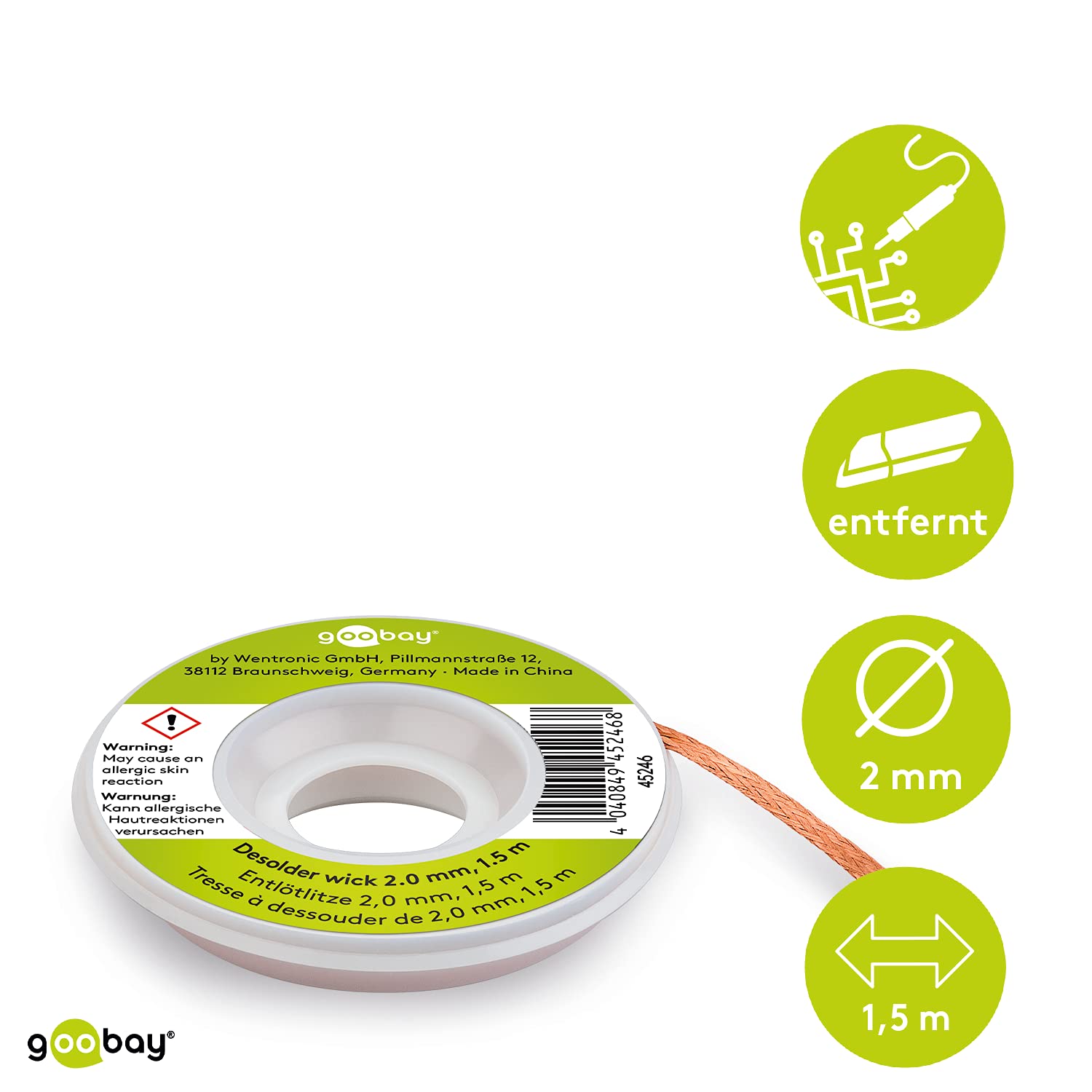 - Produkt 2: 2 mm Entlötlitze ist oxidations- und korrosionsbeständig, hat eine gute Wärmeleitfähigkeit, hinterlässt geringe Rückstände & keine Bruchstellen