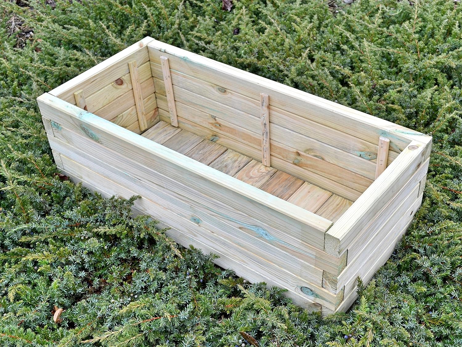 - Material: Holz lackiert, Holzart: Kieferholz grün imprägniert, Masse: Länge = 90cm, Breite = 40 cm, Höhe = 29 cm, Wandstärke: 30 mm.