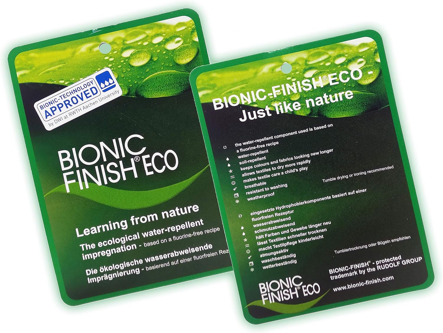 - Bionic Eco Finish – wasserabweisend – aus weichem, bequemem Stoff, der mit einem BIONIC ECO-Finish imprägniert ist, das fluorfrei, wasserabweisend, schmutzabweisend, hält Ihre Kleidung länger wie neu und lässt Textilien schneller trocknen.