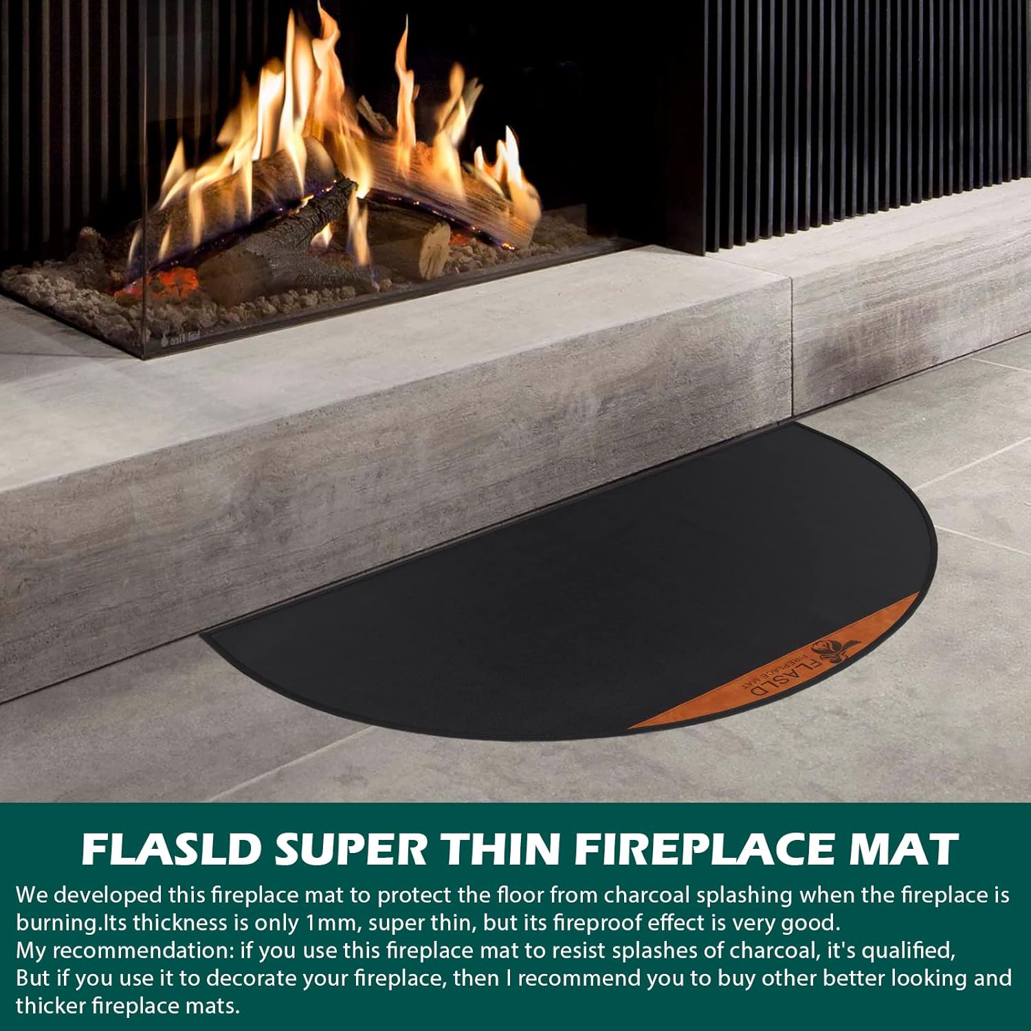 • 🔥【Super Thin】- We developed this fireplace mat to protect the floor from charcoal splashing when the fireplace is burning. Its thickness is only 1mm, super thin, but its fireproof effect is very good. My recommendation: if you use this fireplace mat to resist splashes of charcoal, it's qualified, But if you use it to decorate your fireplace, then I recommend you to buy other better looking and thicker fireplace mats.