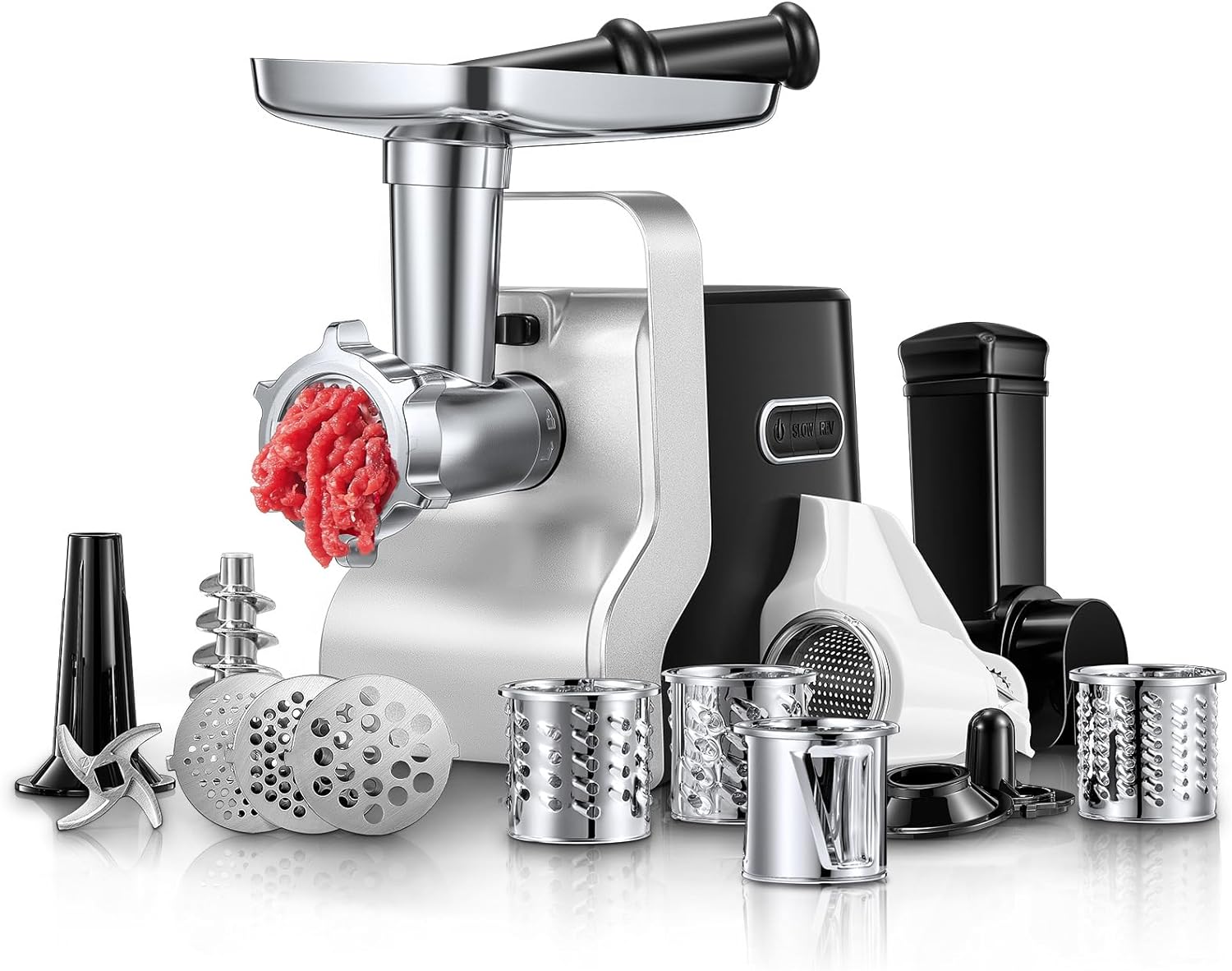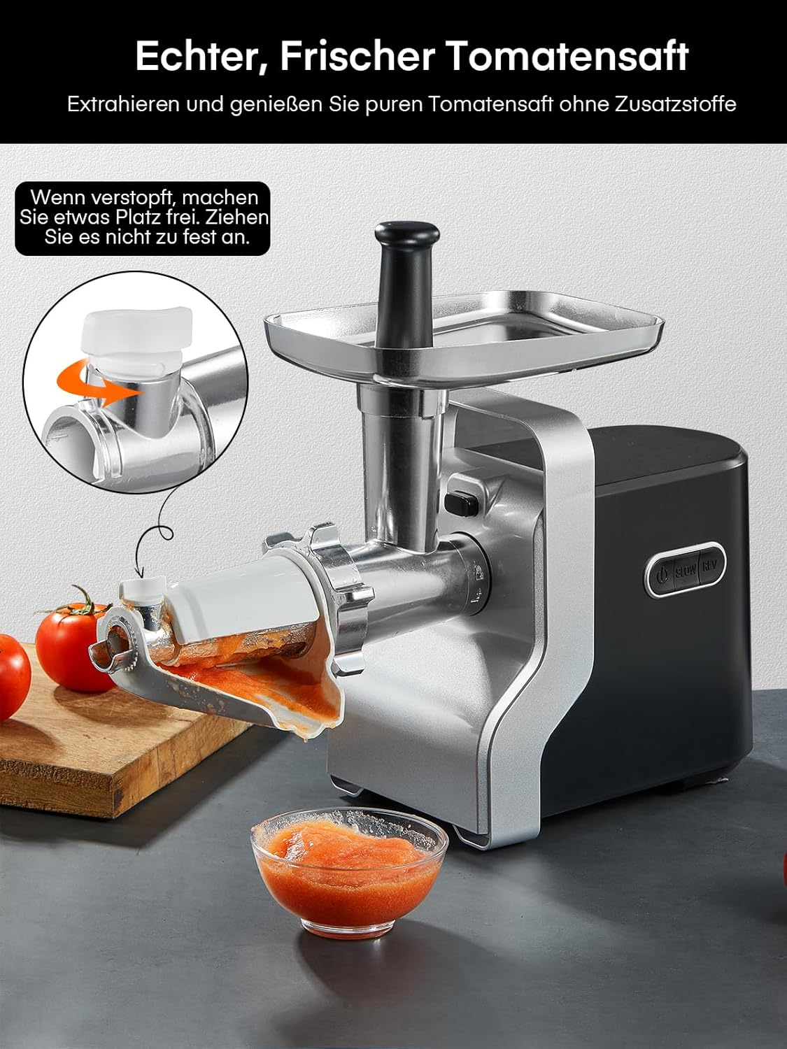 - 【5 in 1Multifunktions】: Der 5-in-1-Fleischwolf kann Fleisch und Fisch mahlen, Gemüse hacken, Käse reiben und Obst und Gemüse pressen und verfügt über andere Funktionen, die in Ihrer Küche viel Hilfe leisten. Erleben wir die Freude an der Lebensmittelverarbeitung.