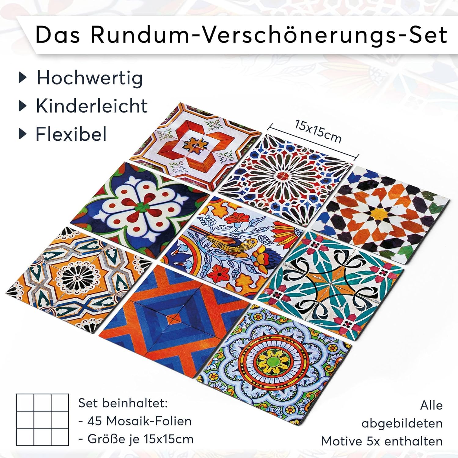 • LANGLEBIG UND ROBUST – Min. 5 Jahre Haltbar, Kratzfest, Reinigungsmittelbeständig, Wasserfest, Hitzebeständig bis 80 °C, kein Ausbleichen! Unsere Mosaik Boden Fliesenfolien sind täuschend echt und jederzeit wiederablösbar.