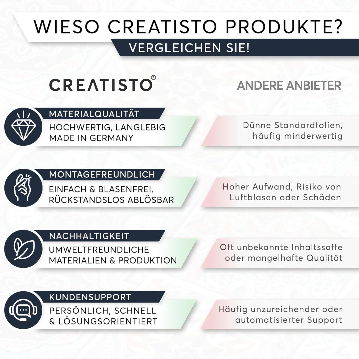 - QUALITÄT MADE IN GERMANY - Unsere original CREATISTO Boden Fliesenaufkleber - entwickelt für Bodenfliesen in Bad oder Küche - werden mit hochwertigen und umweltfreundlichen Materialien in Deutschland gefertigt.