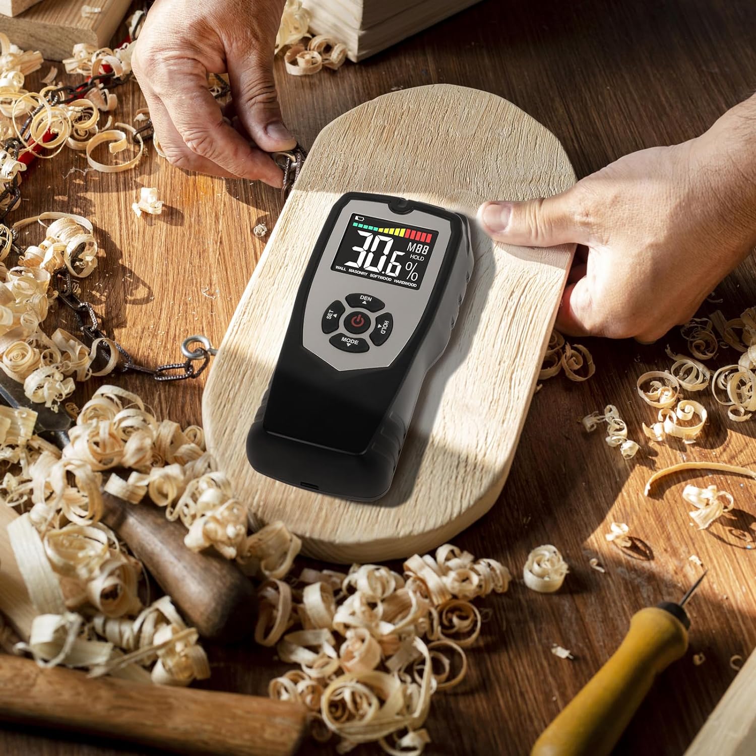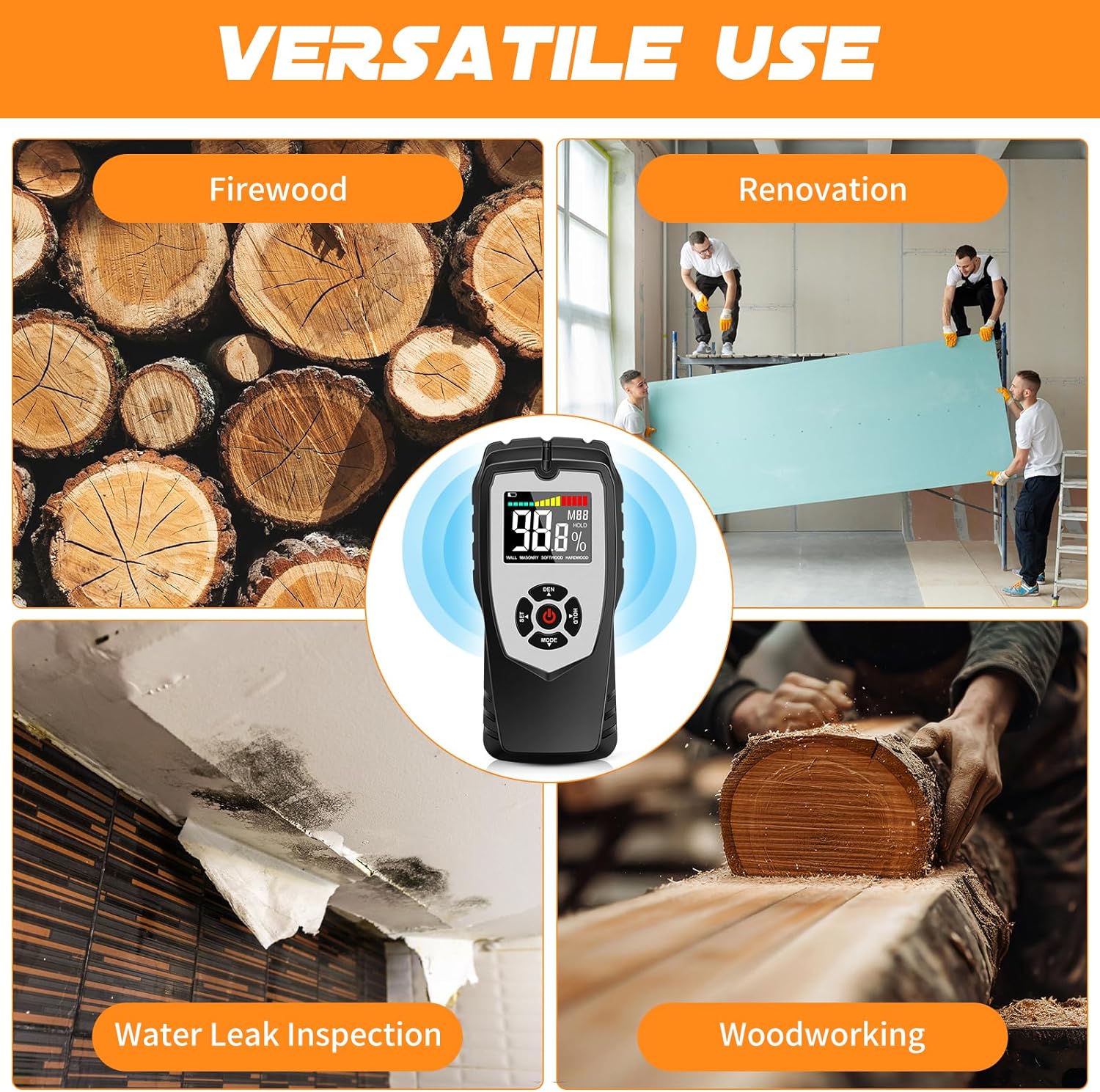 - 【MEHRERE MODI & DICHTESTUFEN】Professionelle feuchtemessgerät haben verschiedene Messmodi und Dichtestufen basierend auf verschiedenen Materialien entwickelt. Einschliesslich Weichholz (0–60 %), Hartholz (0–36 %), Wand (0–20 %), Mauerwerk