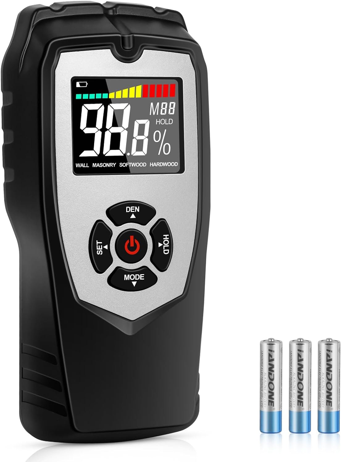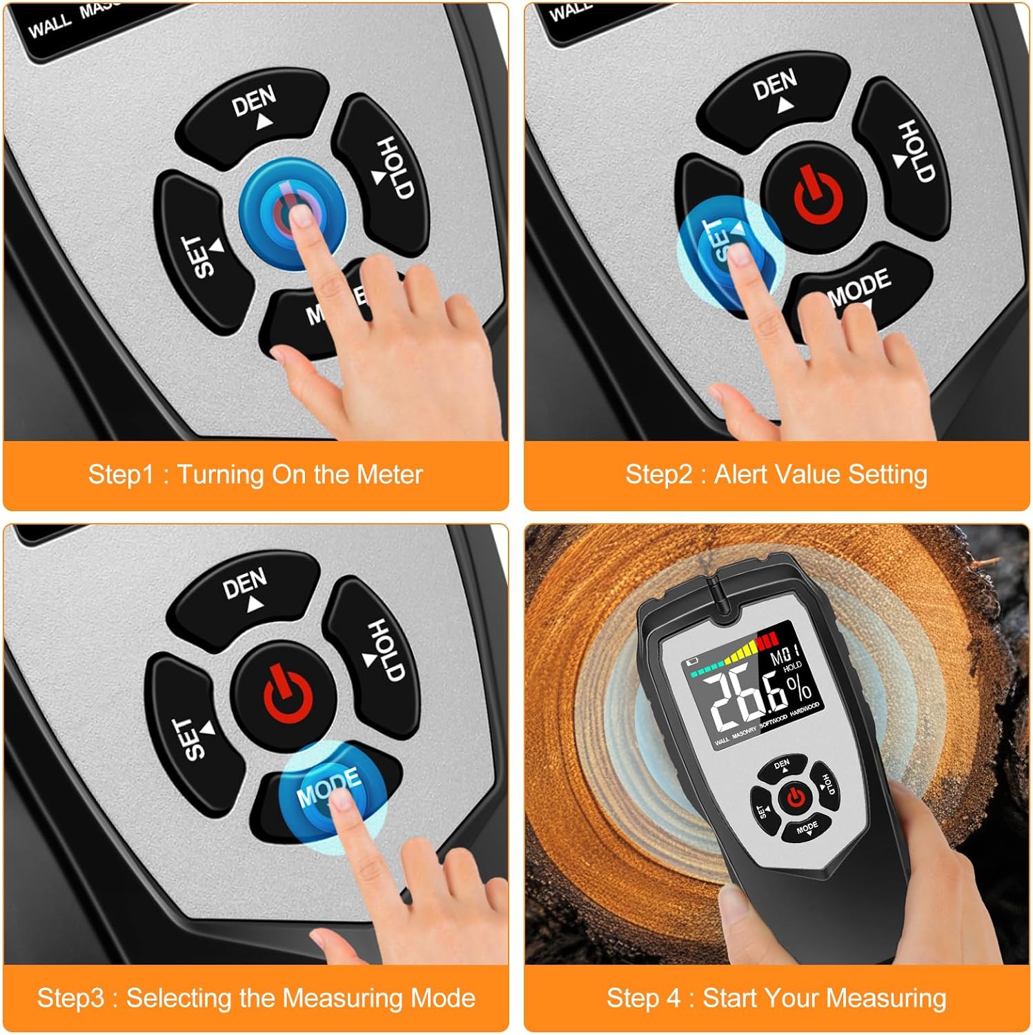 - 【EINFACHE BEDIENUNG】Das wandfeuchtemessgerät ist einfach zu bedienen. Drücken Sie einfach den Netzschalter, um es einzuschalten, wählen Sie den Modus und die Dichtestufe und richten Sie die Sensorplatte auf das Objekt, das Sie messen möchten.