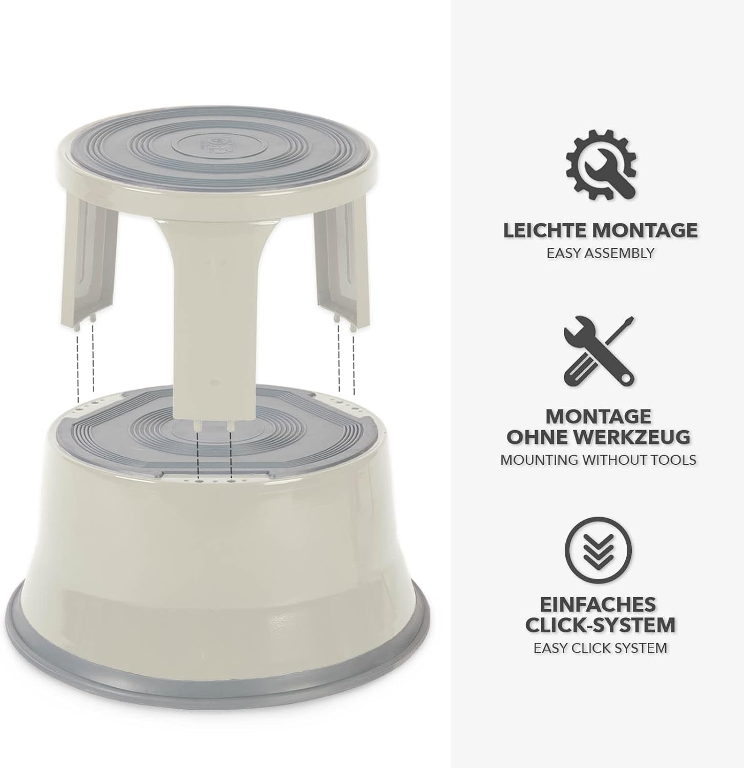 - ✅ SELBSTVERSENKENDE ROLLEN - Dank Auflagen aus rutschhemmendem Gummi bieten die beiden Stufen guten Halt beim Stehen. Sobald der Rollhocker mit Gewicht belastet wird, werden die gefederten Laufrollen nach innen gedrückt und der Tritthocker steht fest
