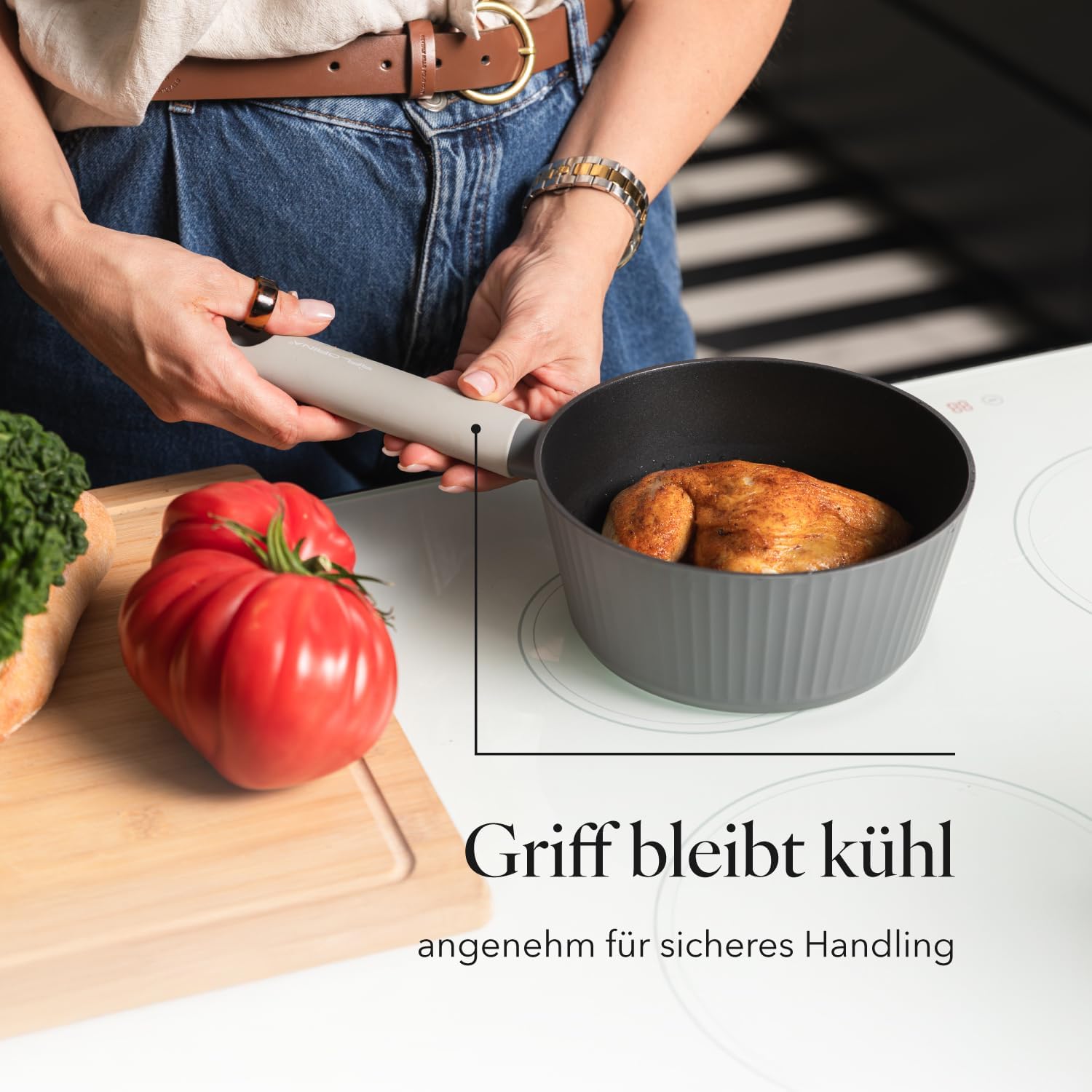 - SICHERER GRIFF: Topf und Deckel haben hellgraue Bakelitgriffe, die zusätzlich mit Soft-Touch-Material beschichtet sind. Dadurch liegen sie perfekt in der Hand und werden beim Gebrauch nicht heiss.