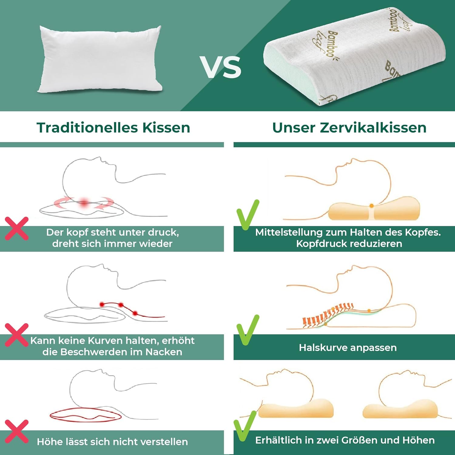 - Die Form unseres Nackenstützkissen aus Memory-Schaumstoff unterscheidet sich völlig von einem normalen Kissen und wurde entwickelt, um die richtige Nackenstütze zu fördern und Nackenschmerzen zu lindern.