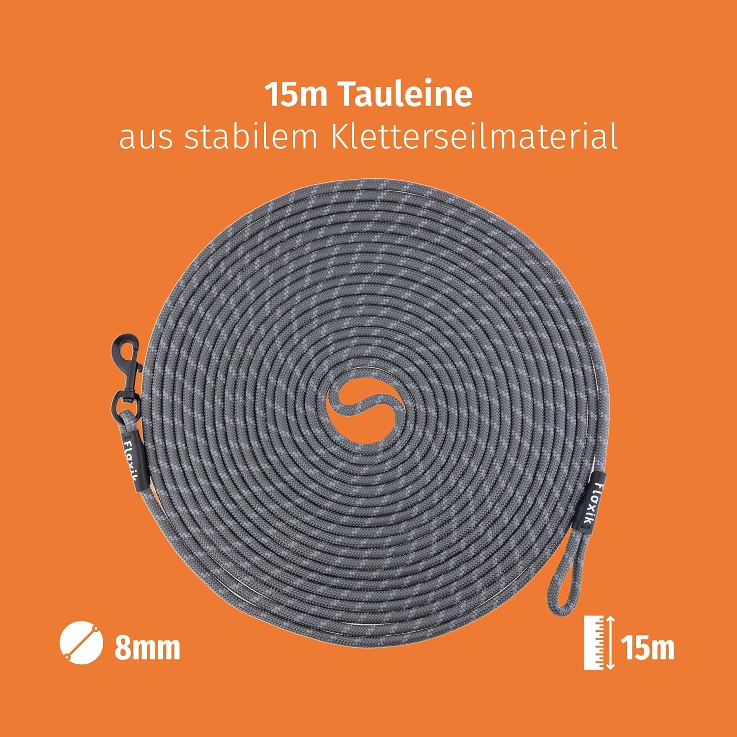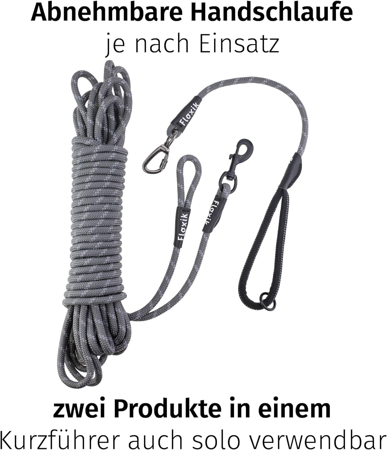 Floxik Schleppleine für Hunde | 5m, 10m, 15m, 20m grau | reflektierende Tauleine mit Abnehmbarer Han