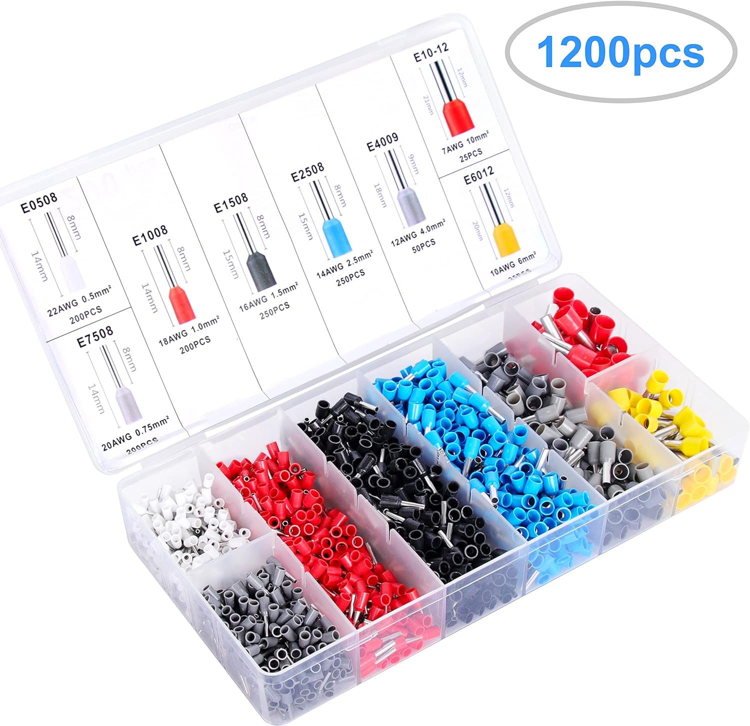 • 🍀【1200 Stück Hülsenklemmen-Kit:】 Das Kit umfasst A.W.G.22-7/0,5-10mm². Die Verwendung von reinem Kupfer im Inneren und einer verzinnten Oberfläche gewährleistet hohe Leitfähigkeit und Oxidationsbeständigkeit. Der Isolator besteht aus