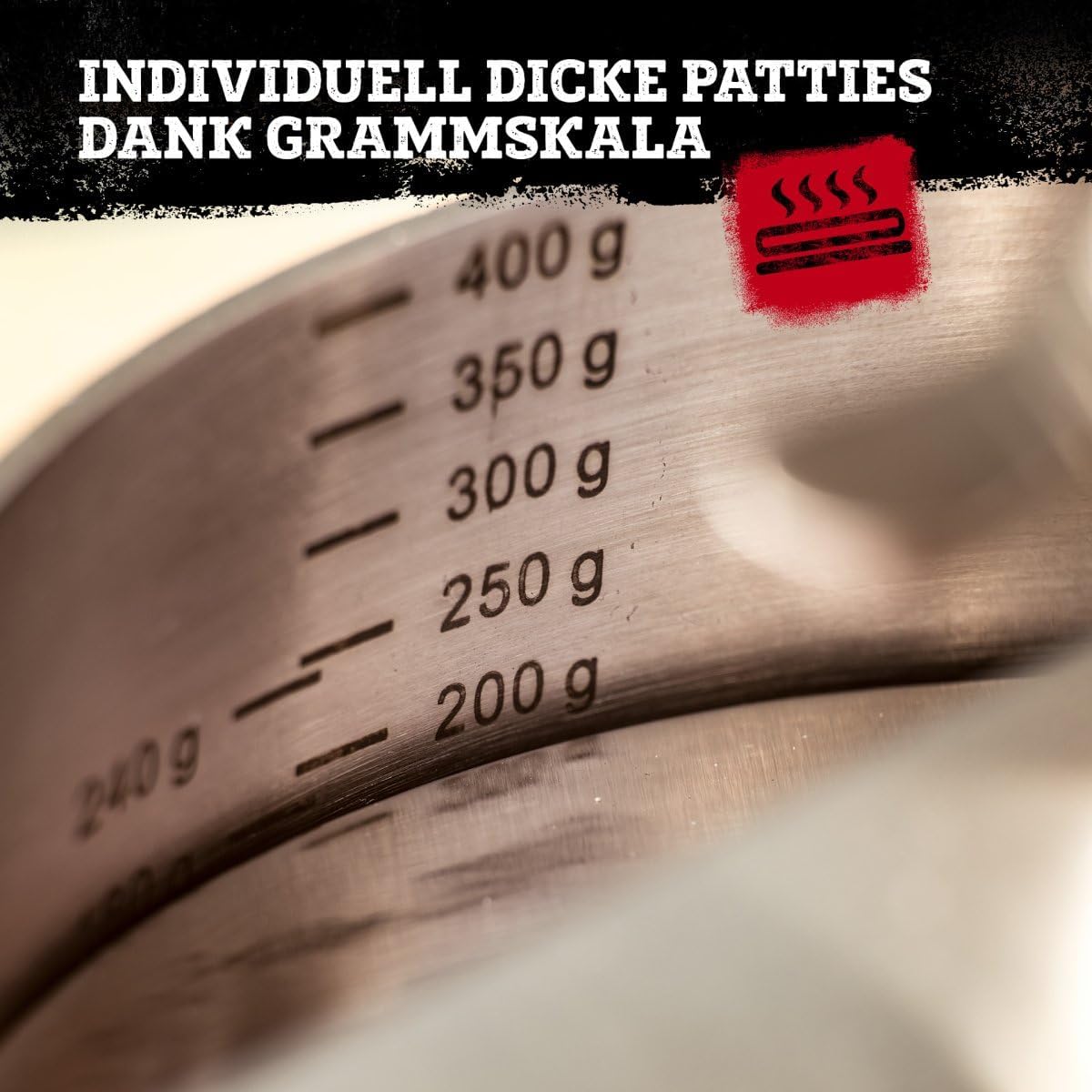 • INDIVIDUELLE PATTIES – Dank Gramm-Skala kann das Hackfleisch formgerecht und gleichmässig gepresst werden, so wird jedes Patty zu einem perfekten Burger