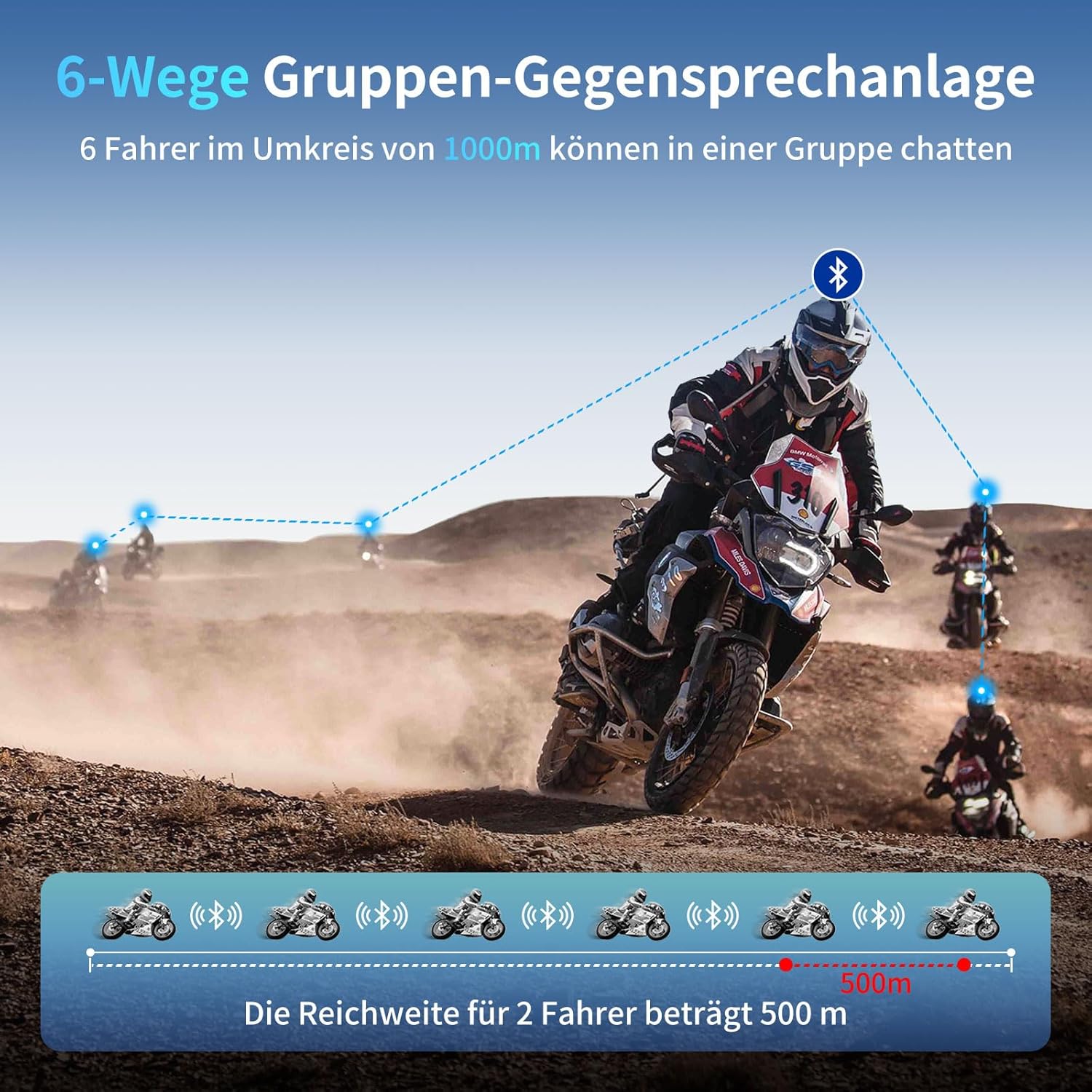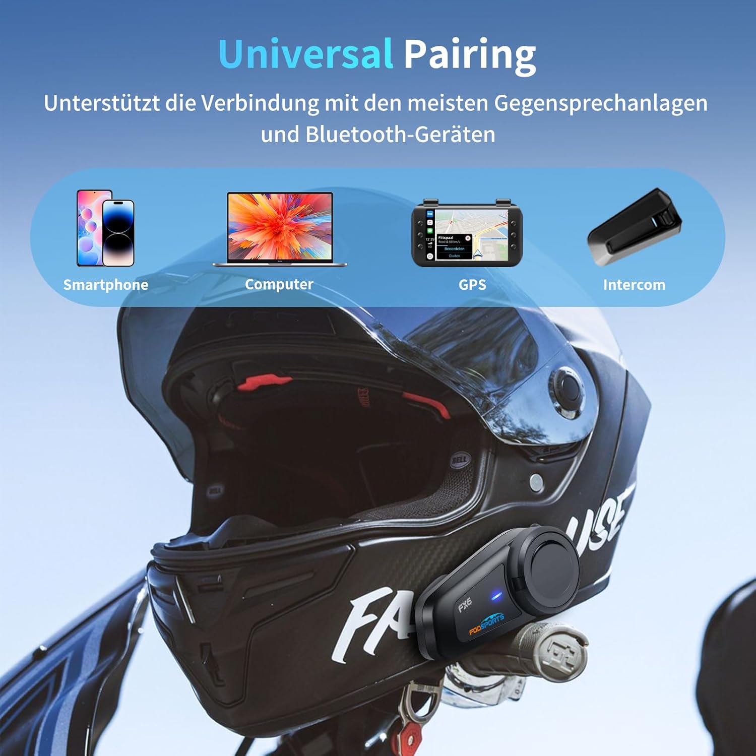 - 【Motorradhelm Kommunikationssystem】Das Motorrad Intercom unterstützt die Kommunikation für bis zu 6 Motorräder mit einer Reichweite von 1000 Metern. Dank der universellen Kopplungsfunktion kann das FODSPORTS FX6 Helm Headset mit den meisten auf
