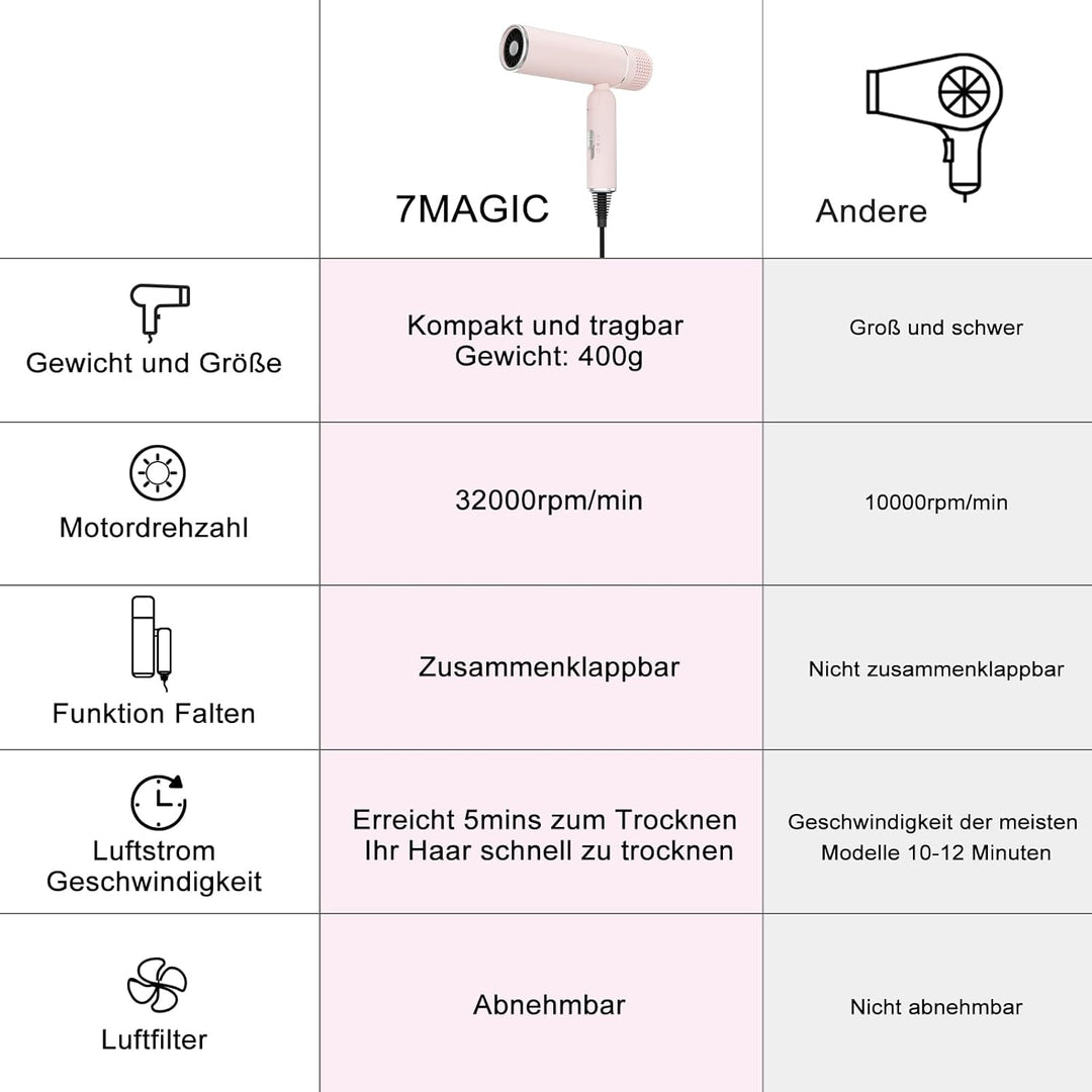- Hervorragender Kundenservice – Der 7MAGIC föhn ist langlebig und robust. Im Lieferumfang enthalten sind 1 7MAGIC hair dryer, 1 Konzentratordüse, 1 Diffusor, eine Aufbewahrungstasche, eine Reinigungsbürste und ein Benutzerhandbuch. Wir bieten eine