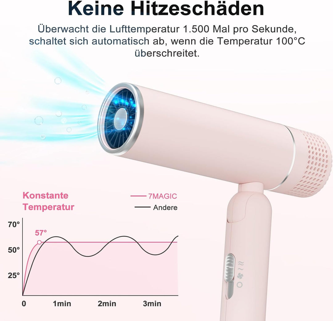 - Glänzendes und Geschmeidiges Haar – Der 7MAGIC Föhn setzt 300 Millionen negative Ionen frei, um Ihr Haar während des Trocknens vor Schäden zu schützen und es sanft zu pflegen. Dank der einzigartigen Ionentechnologie wird die Feuchtigkeit im Haar