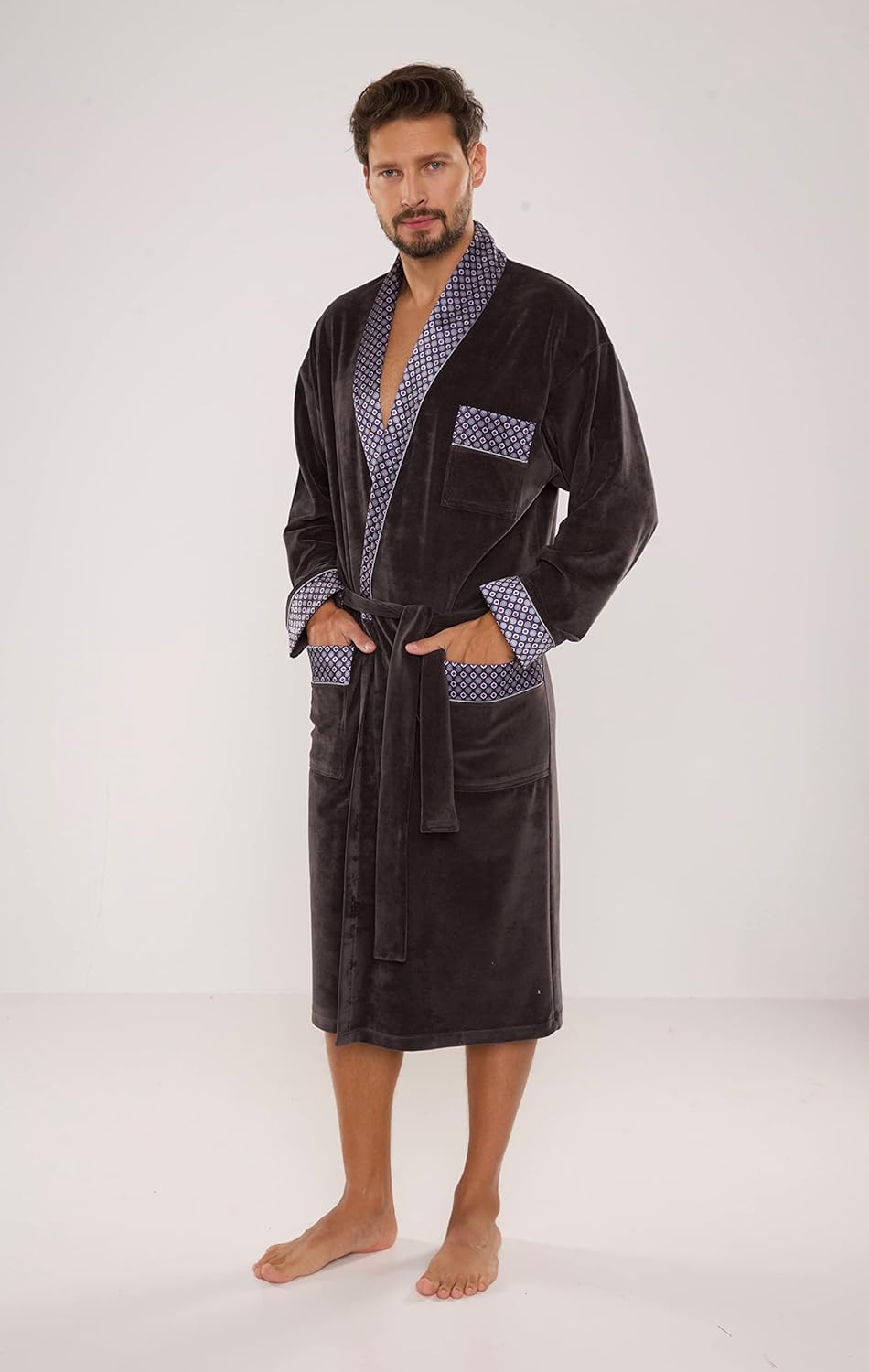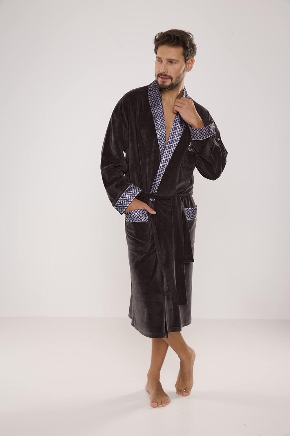 - Mit bequemem Bindegürtel, Schalkragen, zwei seitlichen Taschen und einer praktischen Brusttasche. Ärmel, Taschen sowie Kragen sind mit edlem Muster verziert.