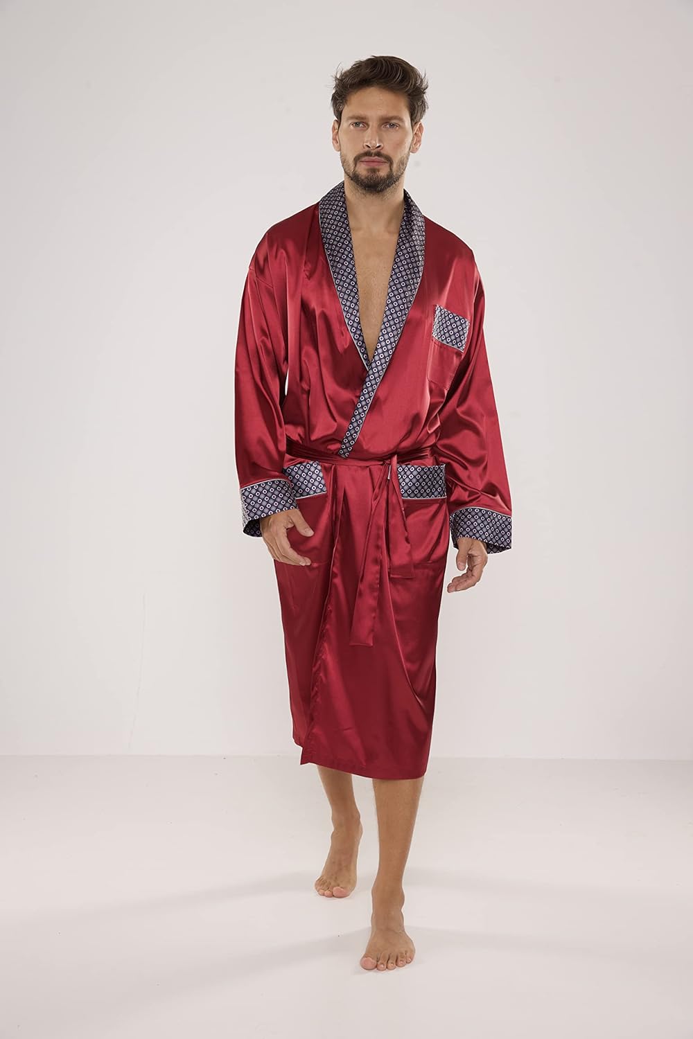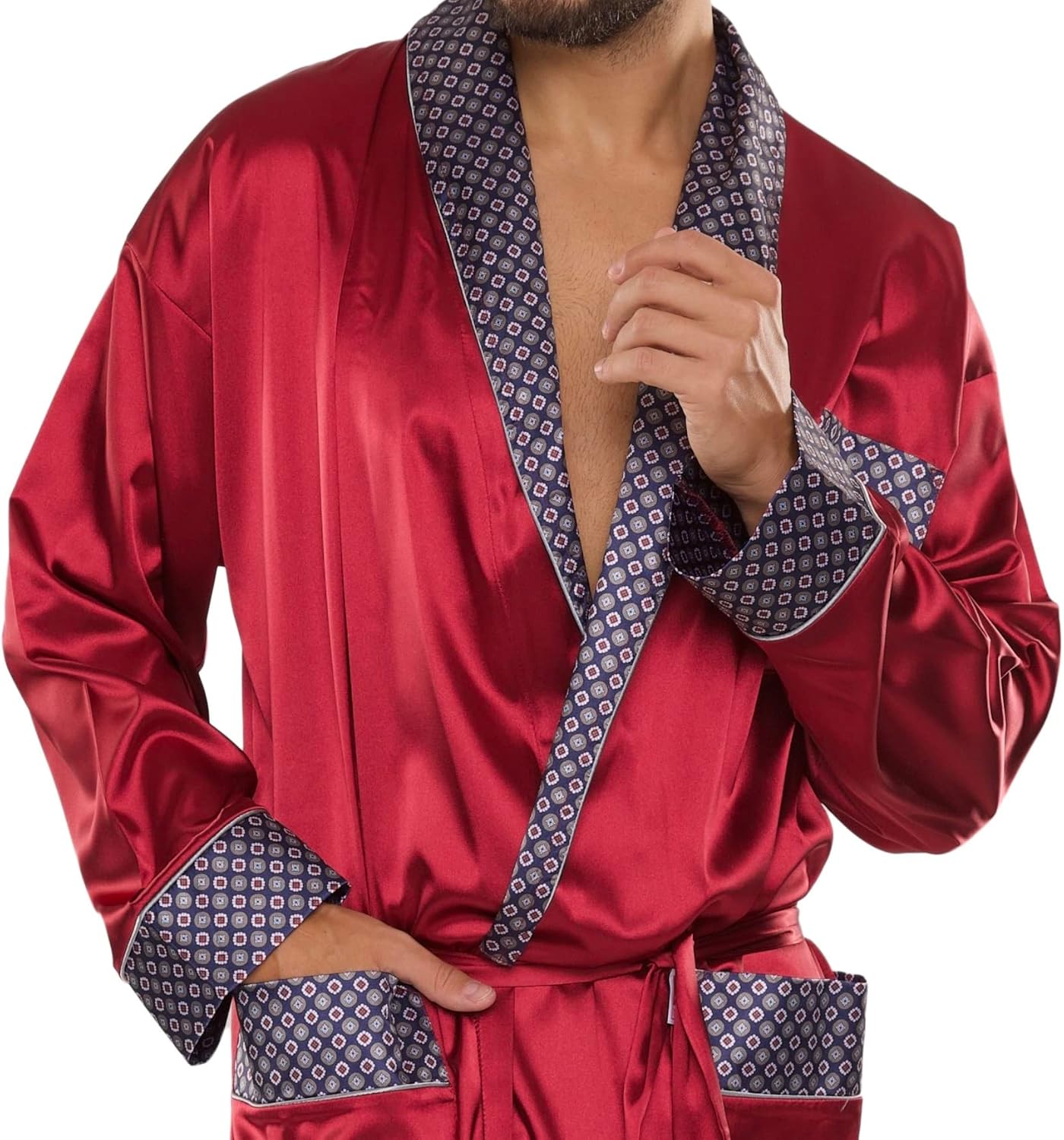 PRODUKTBESCHREIBUNGEN Edler und hochwertiger Satin-Bademantel / Herren-Mantel der Marke FOREX Lingerie Hochwertiges Markenprodukt in verschiedenen Grössen direkt vom EU-Hersteller Im tollen, eleganten Design Mit bequemem Bindegürtel, Schalkragen, zwei seitlichen Taschen und einer praktischen Brusttasche Ärmel, Taschen sowie Kragen sind mit edlem Muster verziert Lang und warm Sehr elegant, stillvoll und angenehm zu tragen Ideale Wahl für Männer, die Komfort und Eleganz zu schätzen wissen. Mehr
