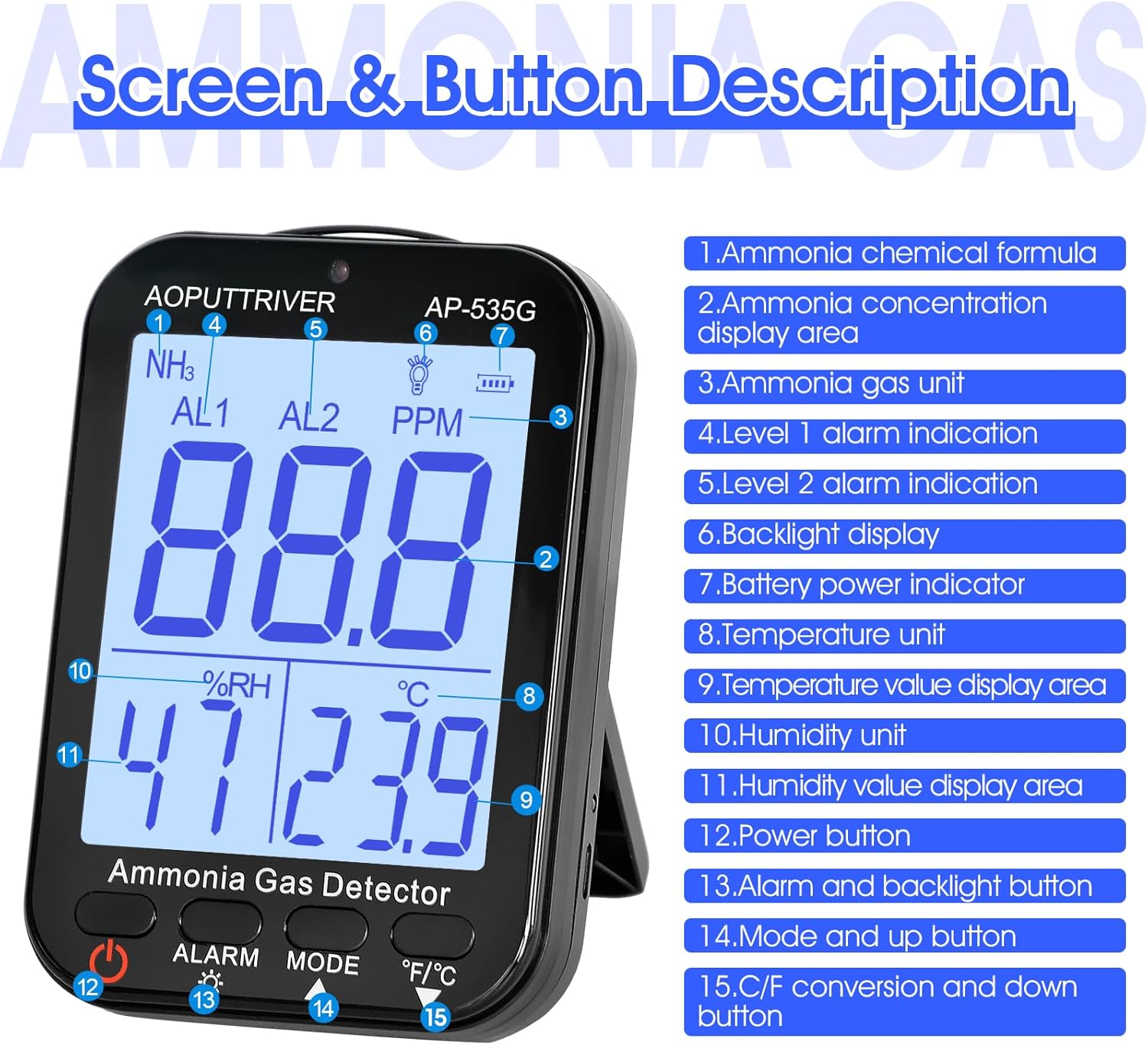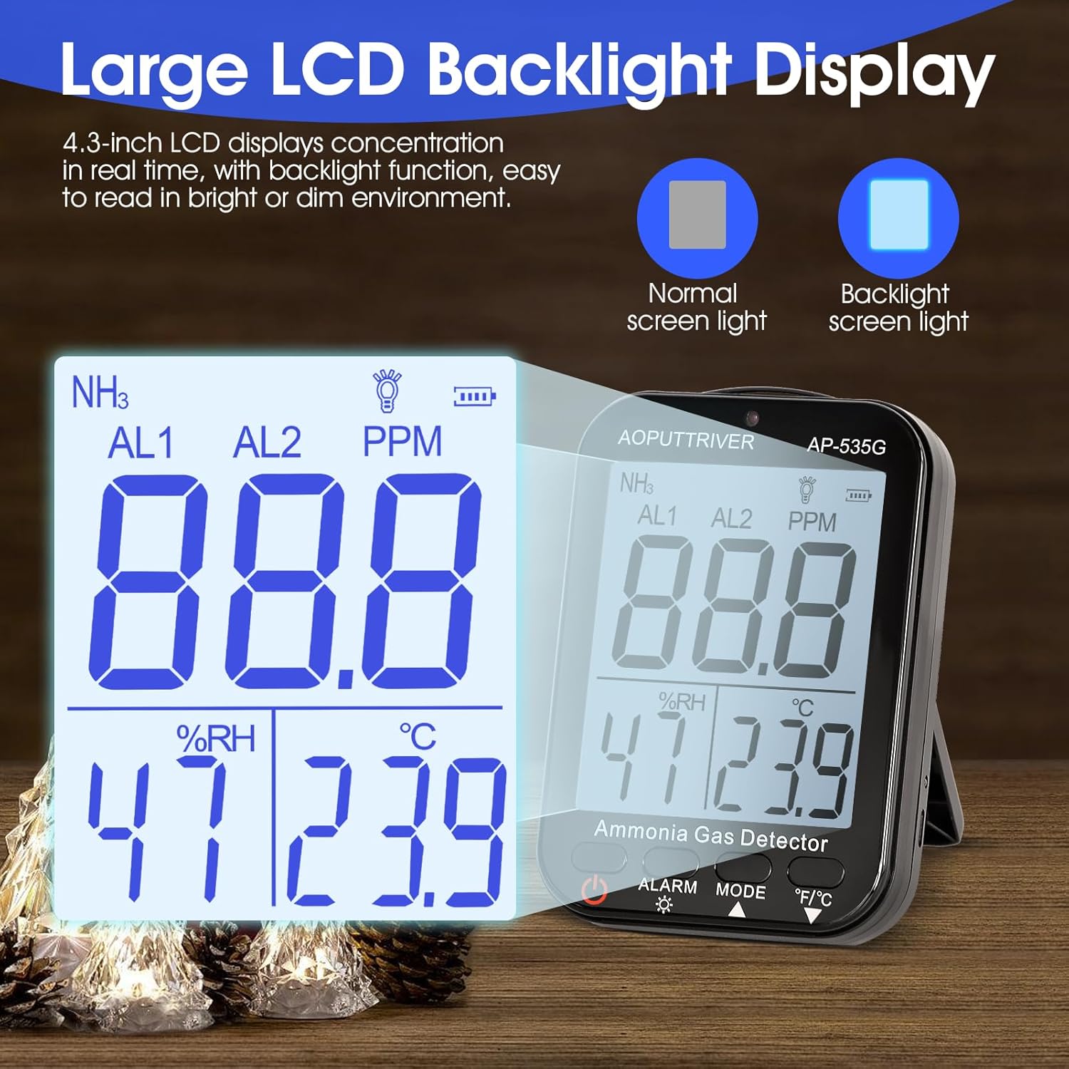 - 【Hintergrundbeleuchtetes LCD-Display】4,3-Zoll-LCD-Display mit Hintergrundbeleuchtung kann den Ammoniakgehalt auch in dunklen Umgebungsbedingungen deutlich anzeigen. Darüber hinaus gibt es ein Aufhängeloch und eine 180°-Halterung auf der Rückseite