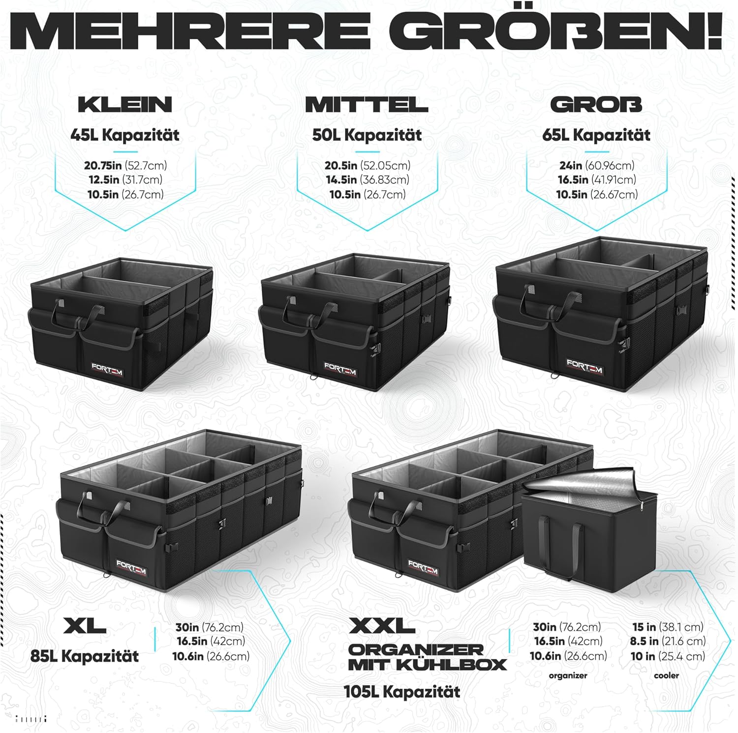 - · Multifunktionale Auto Tasche Kofferraum - Die Fortem Kofferraumboxen machen die Organisation im Auto leicht und einfach. Organisieren Sie eine Vielzahl von Gegenständen, von Lebensmitteln bis zu Büroartikeln, Accessoires (Handtaschen, Schuhe) oder