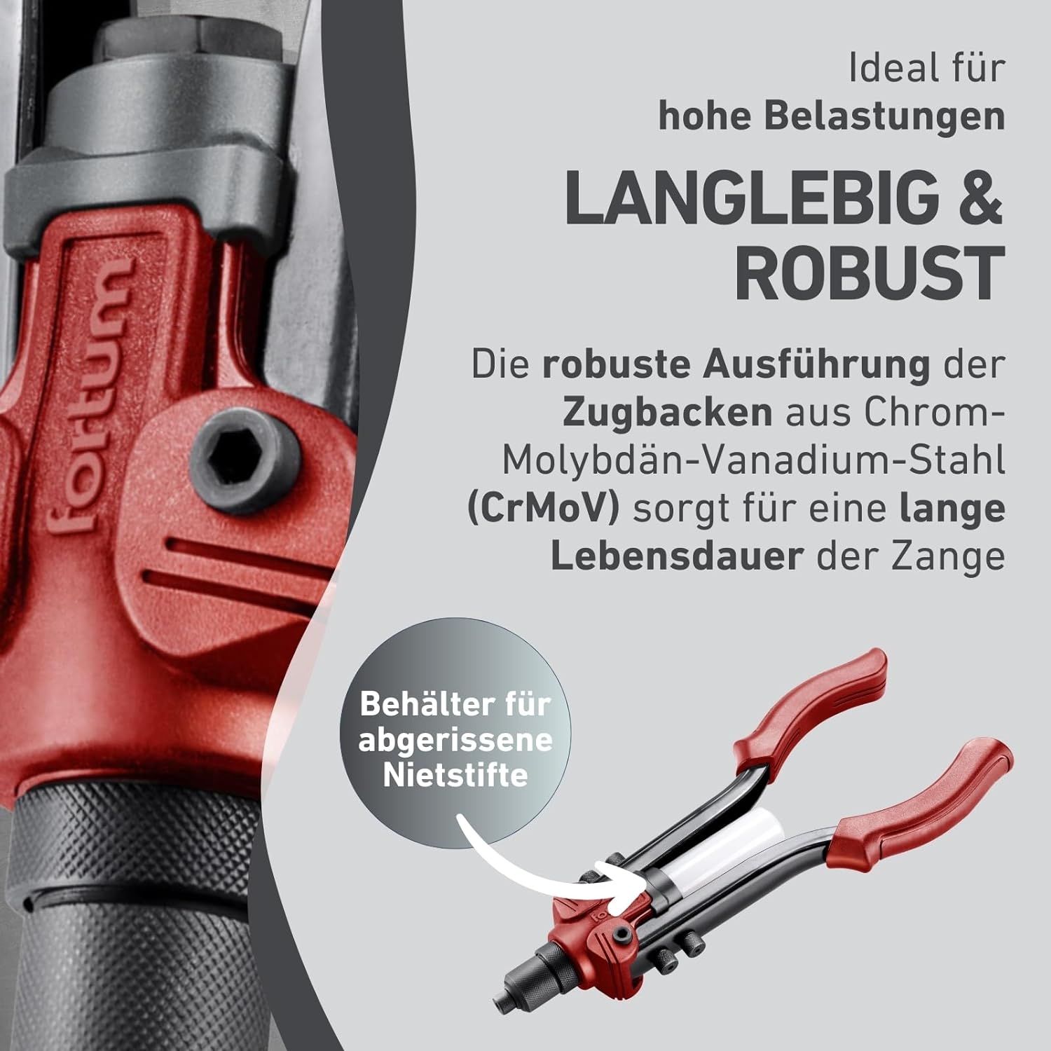 - LANGLEBIG - Die robuste Ausführung der Zugbacken der Pop-Nietzange aus Chrom-Molybdän-Vanadium-Stahl (CrMoV) sorgt für eine lange Lebensdauer der Zange.