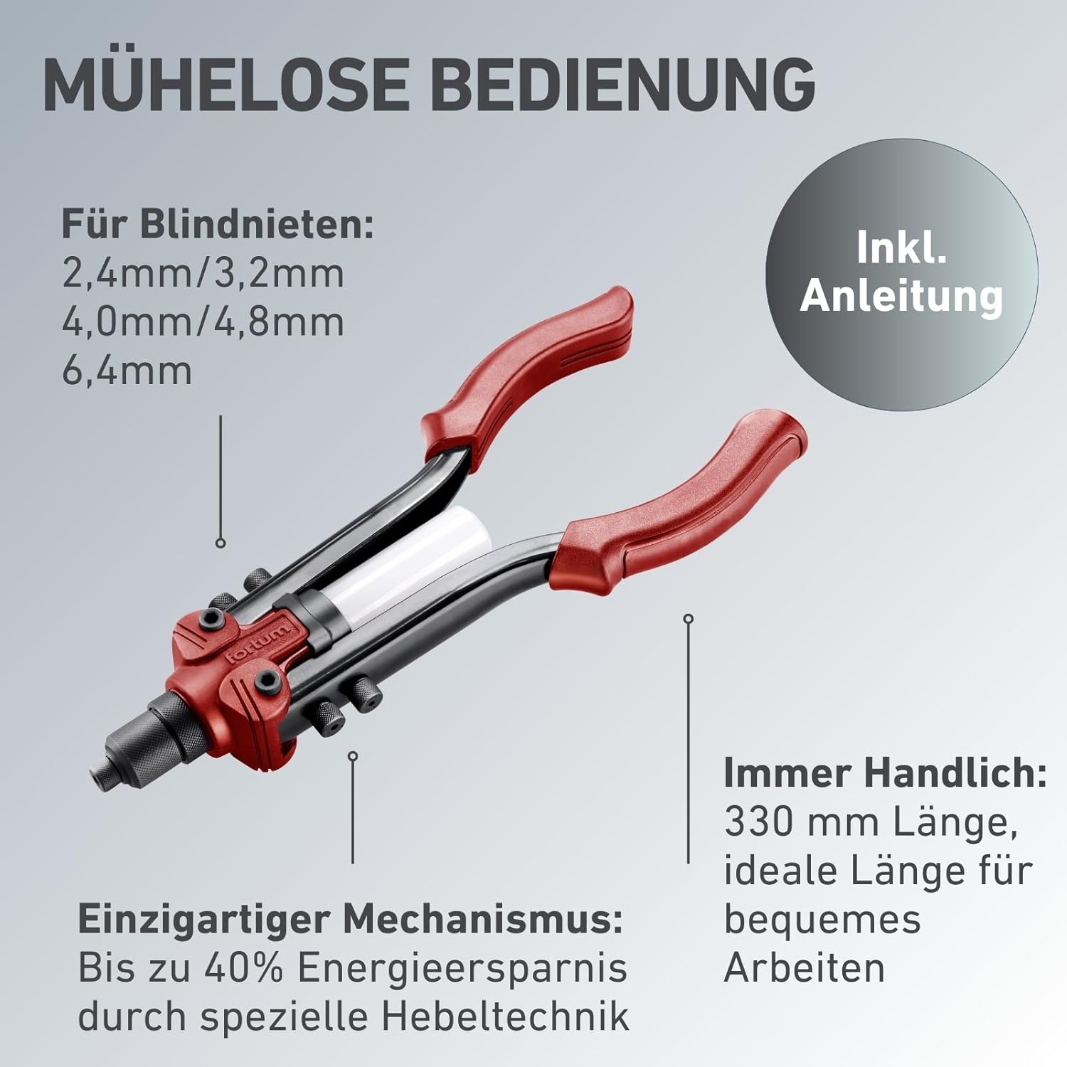 - HEBELWIRKUNG - Die Länge der Gewindenieten-Zange von 330mm & der längere Griff führen zu einer erhöhten Hebelwirkung. Das verringert den geforderten Kraftaufwand.