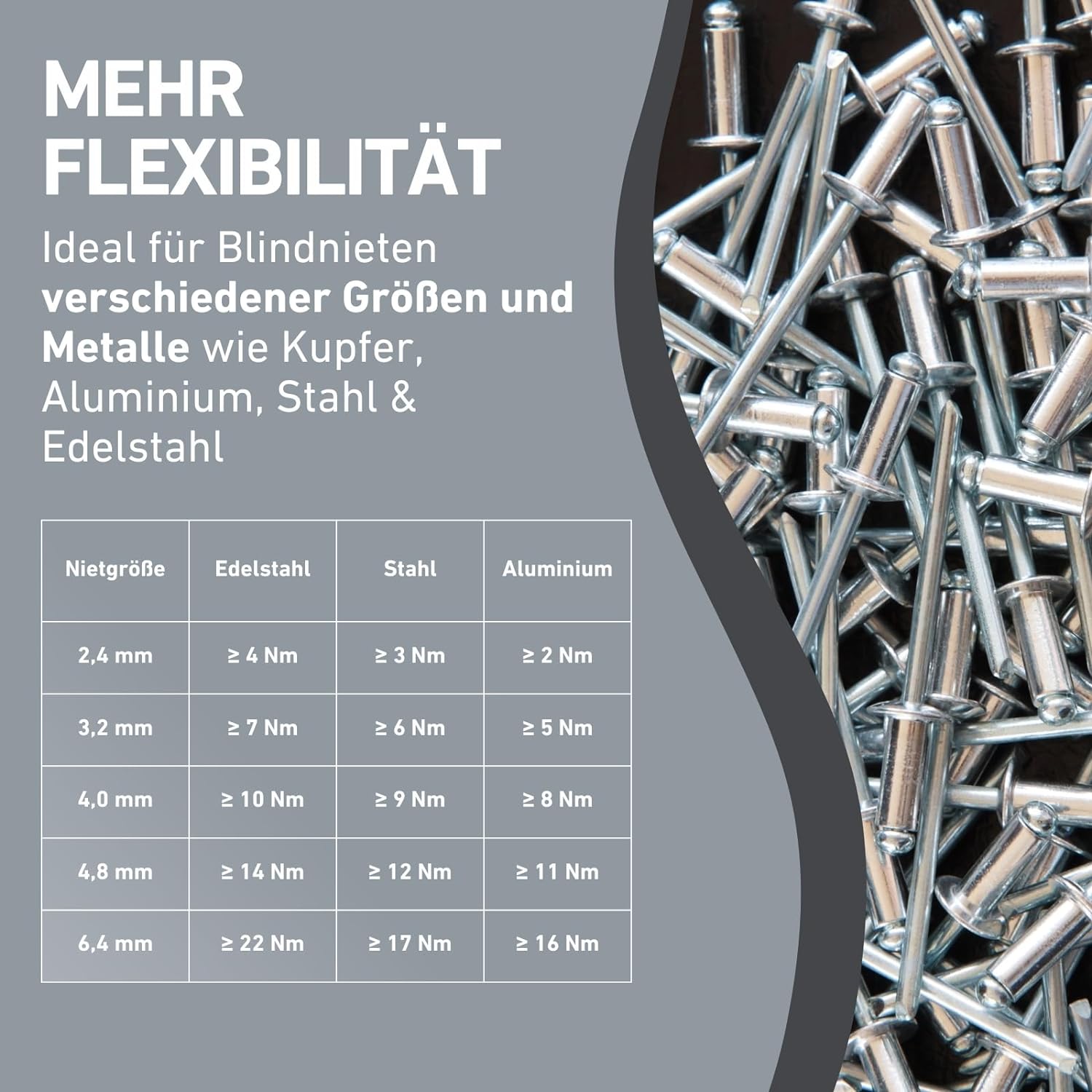 - VERSCHIEDENE NIETEN-GRÖSSEN - Die Nietenpistole eignet sich für Blindnieten, Reissnieten & Popnieten mit den Grössen 2,4mm; 3,2mm, 4,0mm, 4,8mm, 6,0mm & 6,4mm.