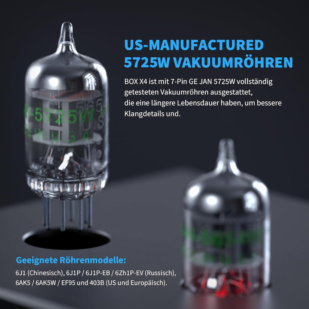 - Röhrenkopfhörerverstärker und -vorverstärker: Der BOX X4 ist mit einem 3,5-mm-AUX-Kopfhörer und einem RCA-Ausgang ausgestattet, der über alle Vorstellungskraft hinaus äusserst nützlich ist.