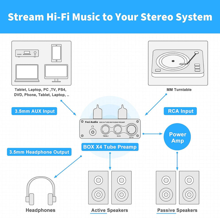 - JAN 5654W Röhren-MM-Phono-Vorverstärker: Der BOX X4 Phono Vorverstärker unterstützt 3,5-mm-AUX- und MM-Plattenspieler-Eingänge und wandelt Phono-Signale in Line-Pegel-Signale mit rauscharmen integrierten Schaltkreisen und hochwertigen Komponenten